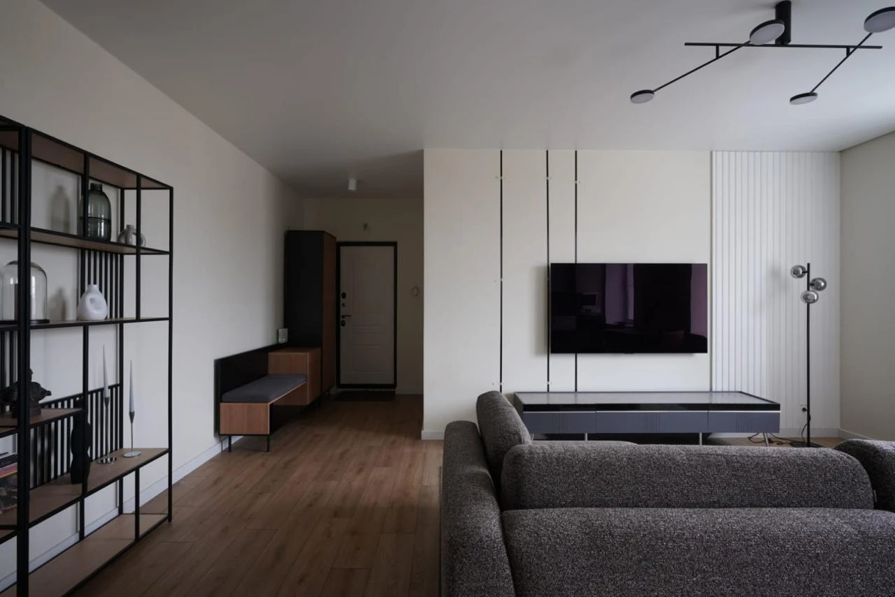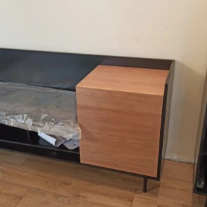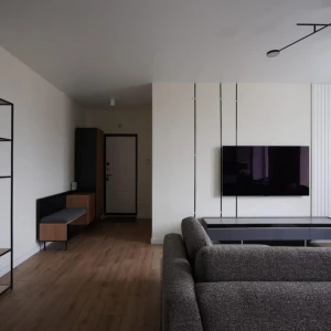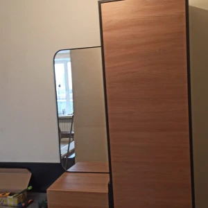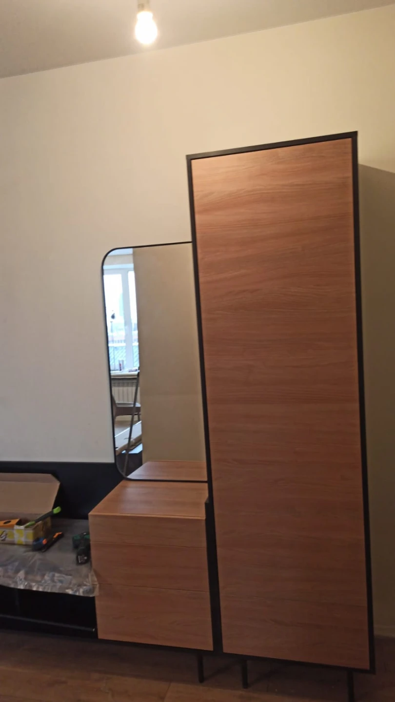 В нижней части шкафа выдвижной ящик на скрытых направляющих. Отделение за дверью укомплектовано как выдвижной штангой, которая крепится на верхнюю несъёмную полку, так и тремя съёмными полками.