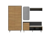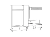 В нижней части шкафа два выдвижных ящика на скрытых направляющих. За дверями в верхней части полка для хранения предметов, высота проема 300мм. Средняя часть поделена перегородкой на отделение с выдвижной штангой и отделение с тремя съёмными полками.