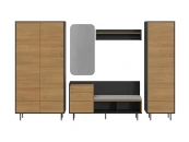 В нижней части шкафа два выдвижных ящика на скрытых направляющих. За дверями в верхней части полка для хранения предметов, высота проема 300мм. Средняя часть поделена перегородкой на отделение с выдвижной штангой и отделение с тремя съёмными полками.