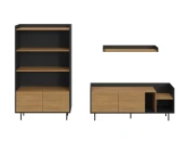 Особенность линейки заключается в контрасте элементов. Скругленные изящные металлические ножки поддерживают внушительное основание. При этом внешний вид моделей остается лёгким и элегантным. Также игру противоположностей усиливают древесная текстура на фасадах и черный цвет боковин с задней стенкой. Что придаёт большей динамики и выразительности дизайну. Эксклюзивность и завершенный вид воссоздает рамка, возвышающаяся над верхним горизонтом. Минималистичный вид конструкциям обеспечивает скрытая фурнитура. Двери и ящики открываются плавно, без шума и усилий. Комбинируйте комоды и серванты Look для создания целостного образа интерьера.
