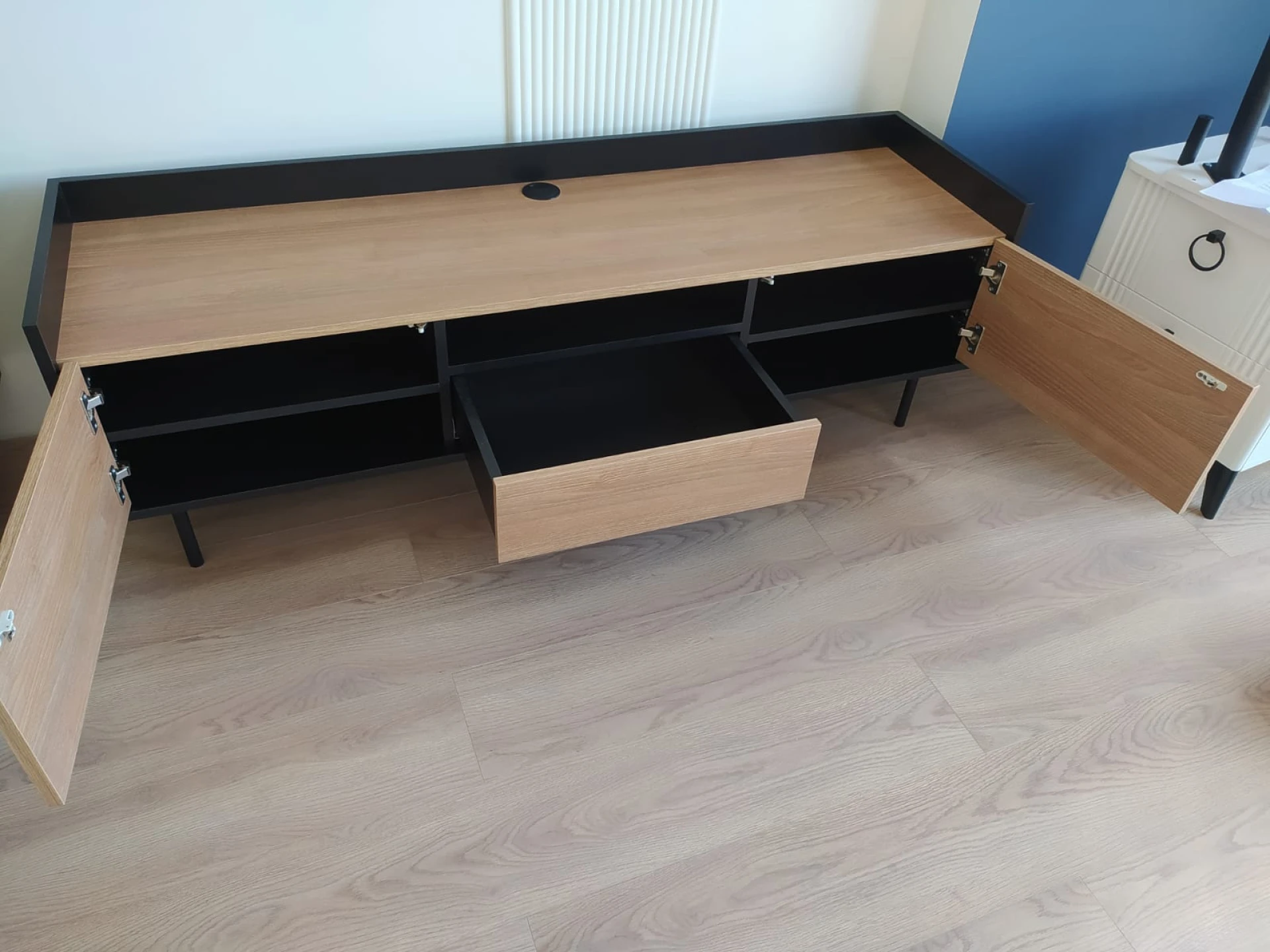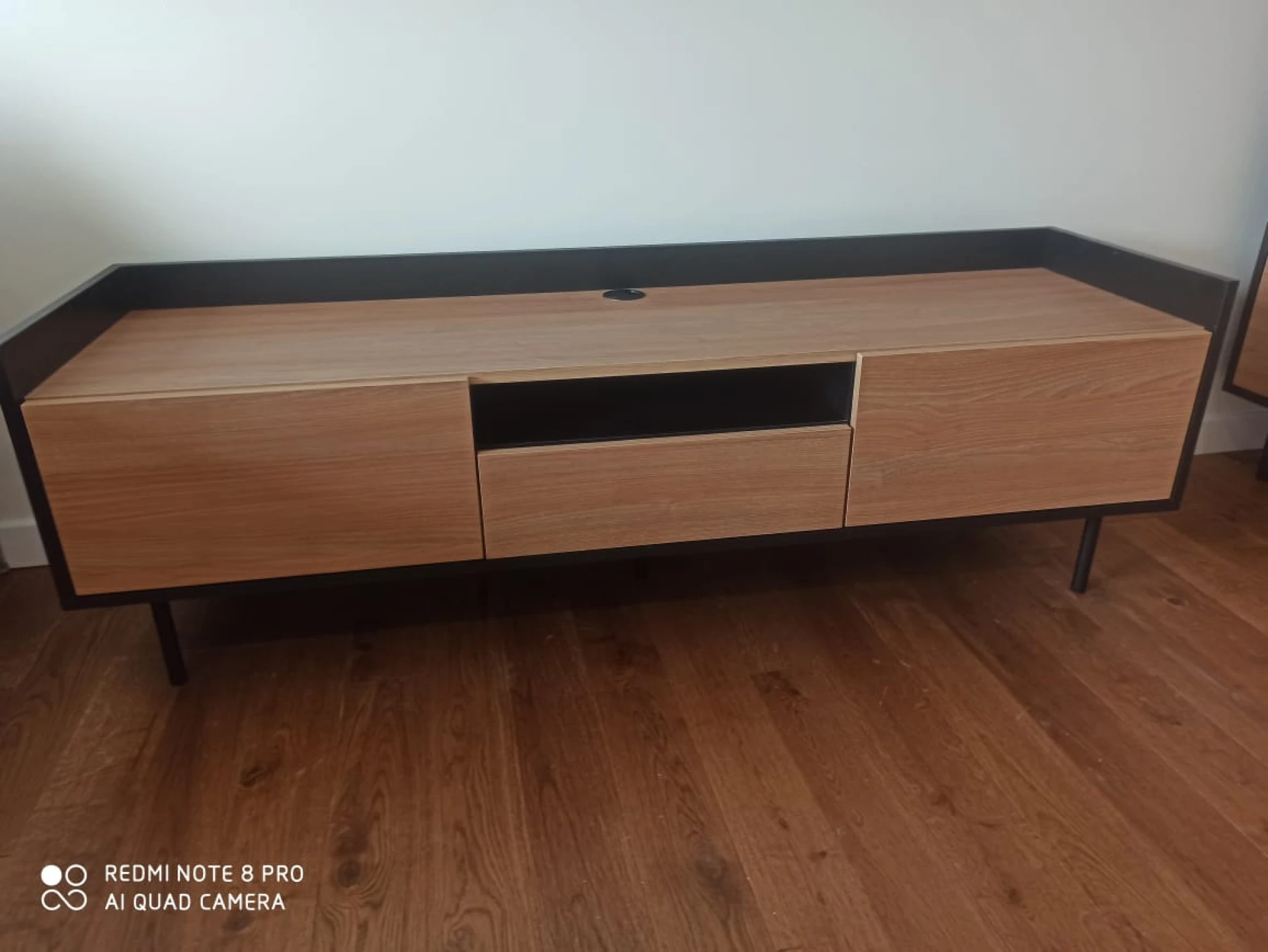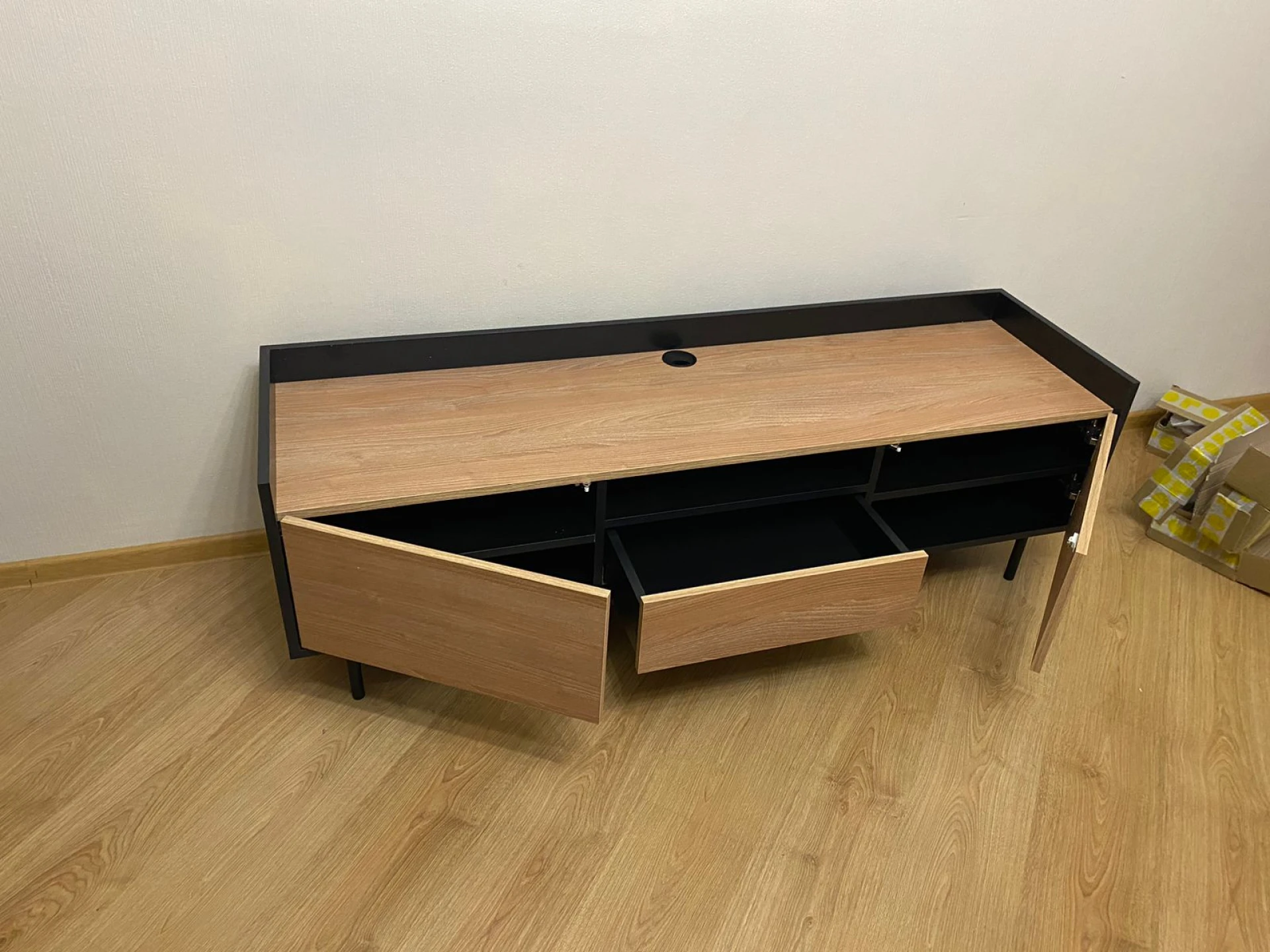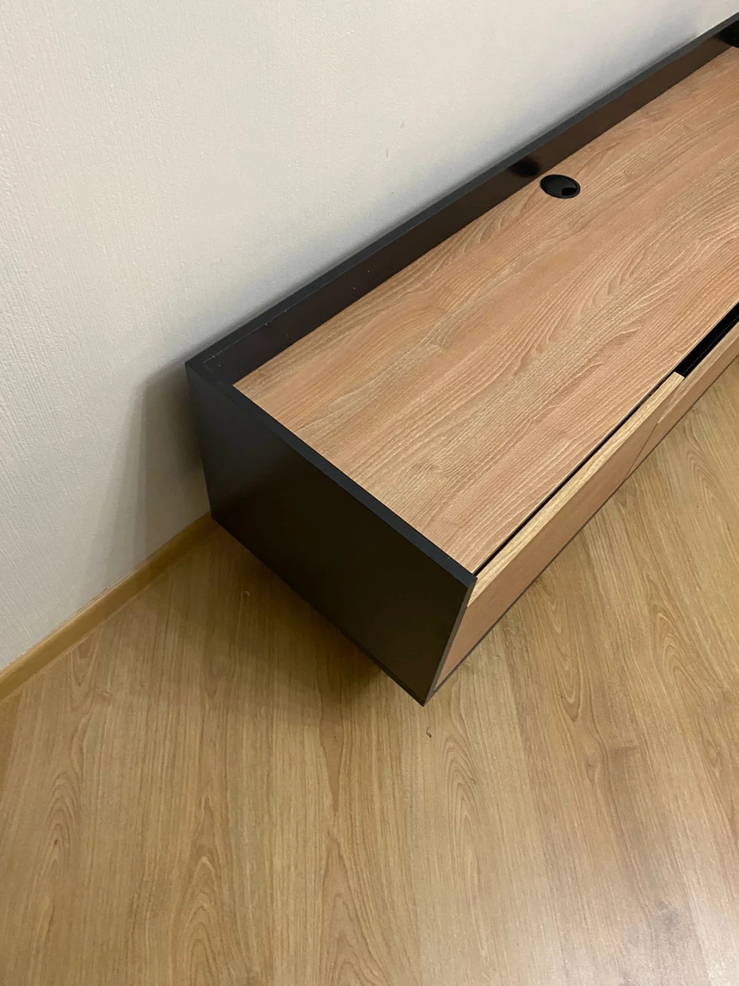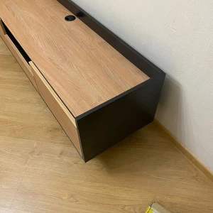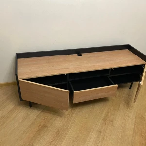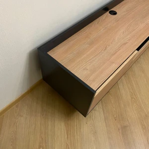 Особенность линейки заключается в контрасте элементов. Скругленные изящные металлические ножки поддерживают внушительное основание. При этом внешний вид моделей остается лёгким и элегантным. Также игру противоположностей усиливают древесная текстура на фасадах и черный цвет боковин с задней стенкой. Что придаёт большей динамики и выразительности дизайну. Эксклюзивность и завершенный вид воссоздает рамка, возвышающаяся над верхним горизонтом. Минималистичный вид конструкциям обеспечивает скрытая фурнитура.