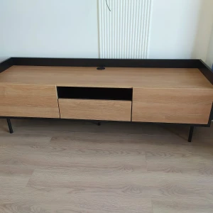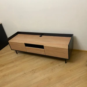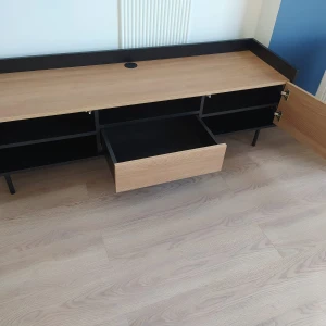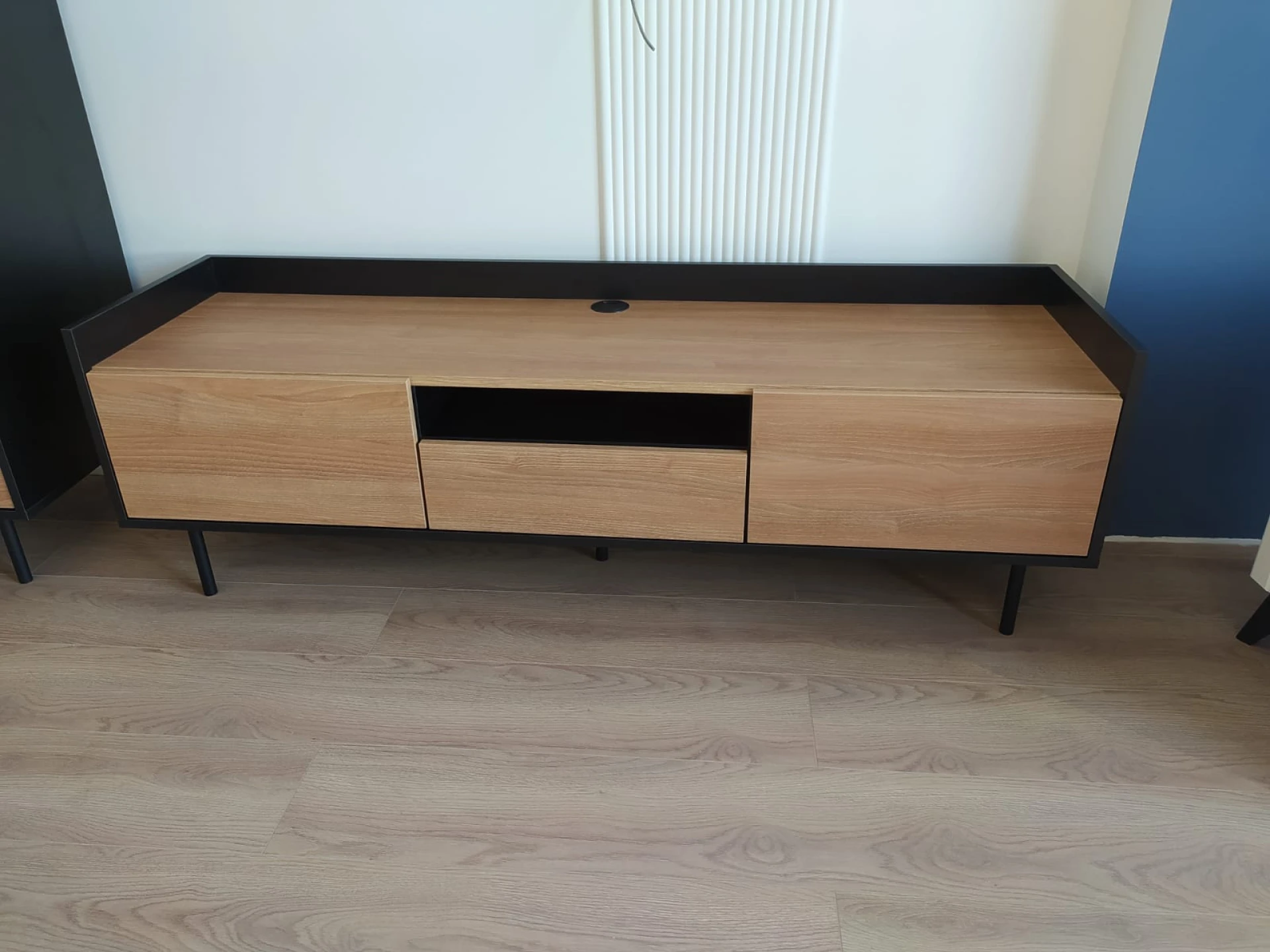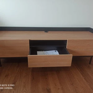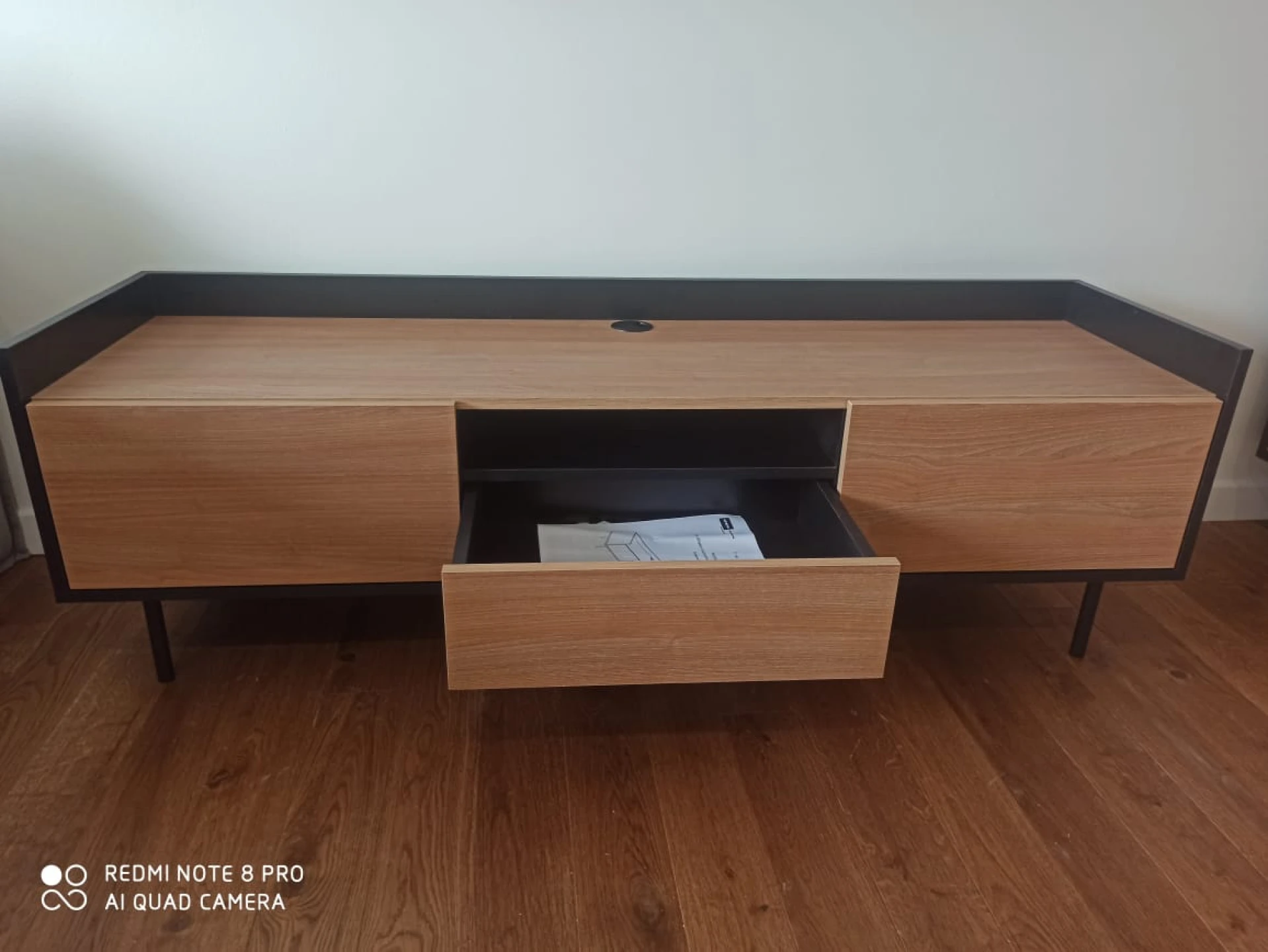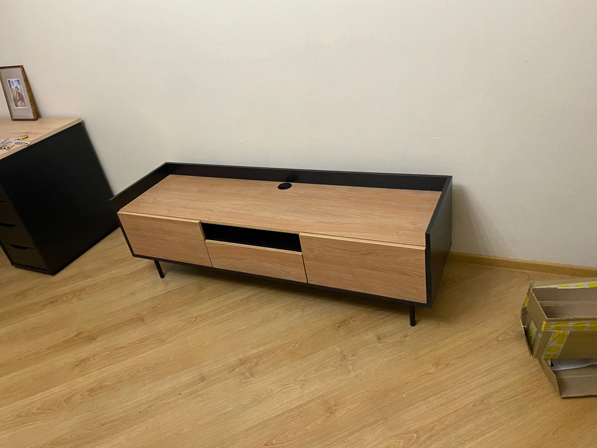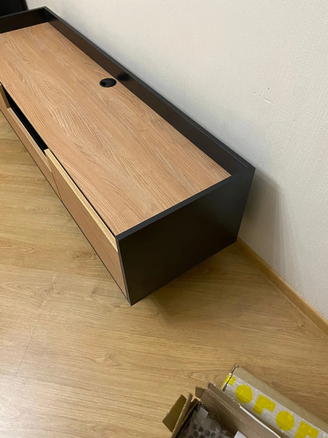 Особенность линейки заключается в контрасте элементов. Скругленные изящные металлические ножки поддерживают внушительное основание. При этом внешний вид моделей остается лёгким и элегантным. Также игру противоположностей усиливают древесная текстура на фасадах и черный цвет боковин с задней стенкой. Что придаёт большей динамики и выразительности дизайну. Эксклюзивность и завершенный вид воссоздает рамка, возвышающаяся над верхним горизонтом. Минималистичный вид конструкциям обеспечивает скрытая фурнитура.