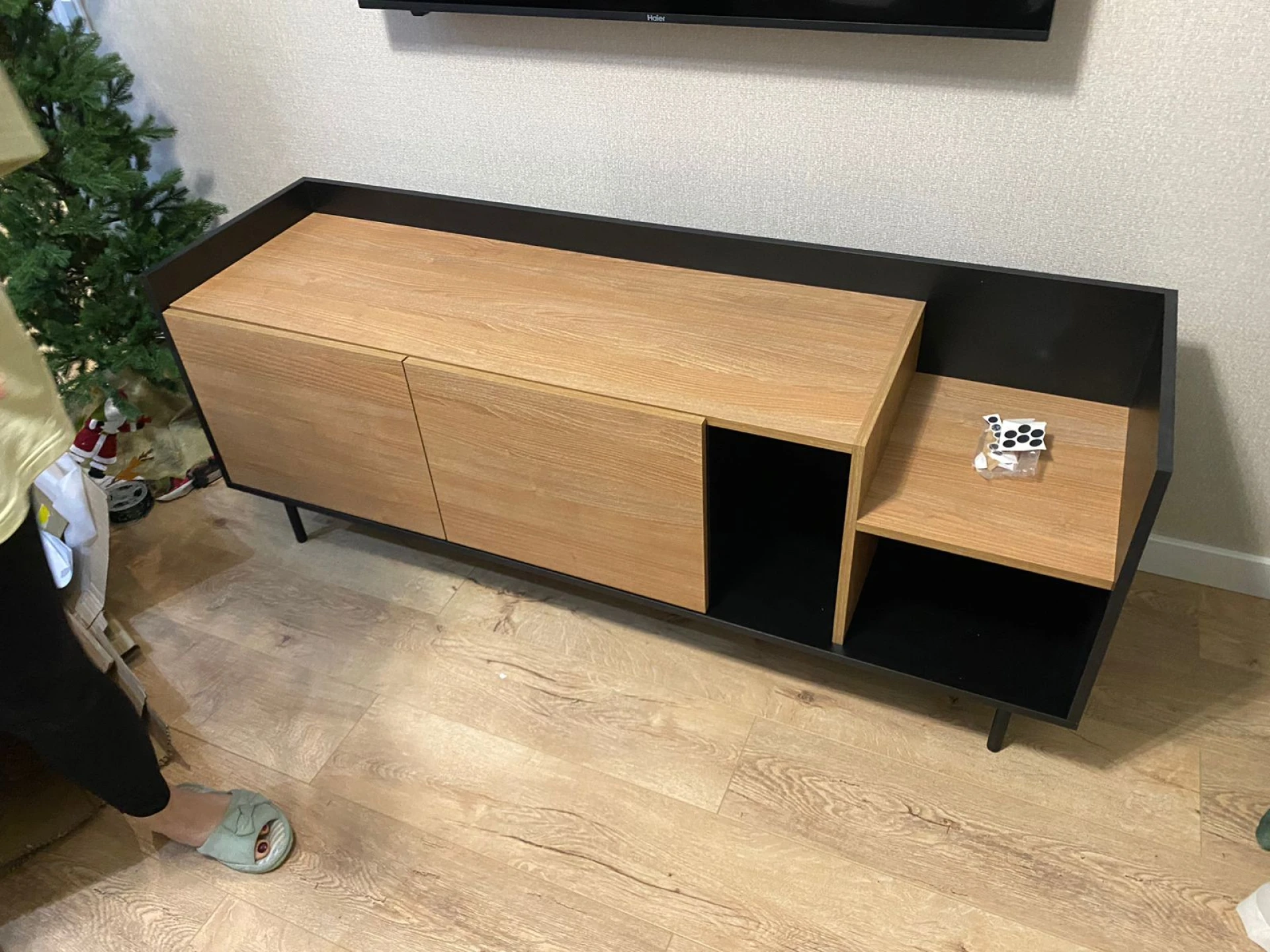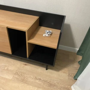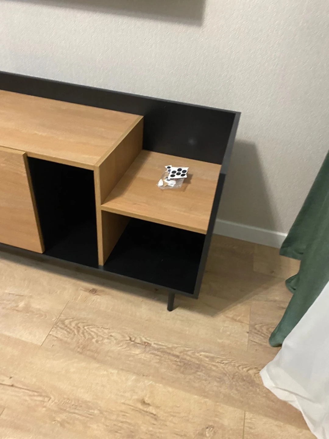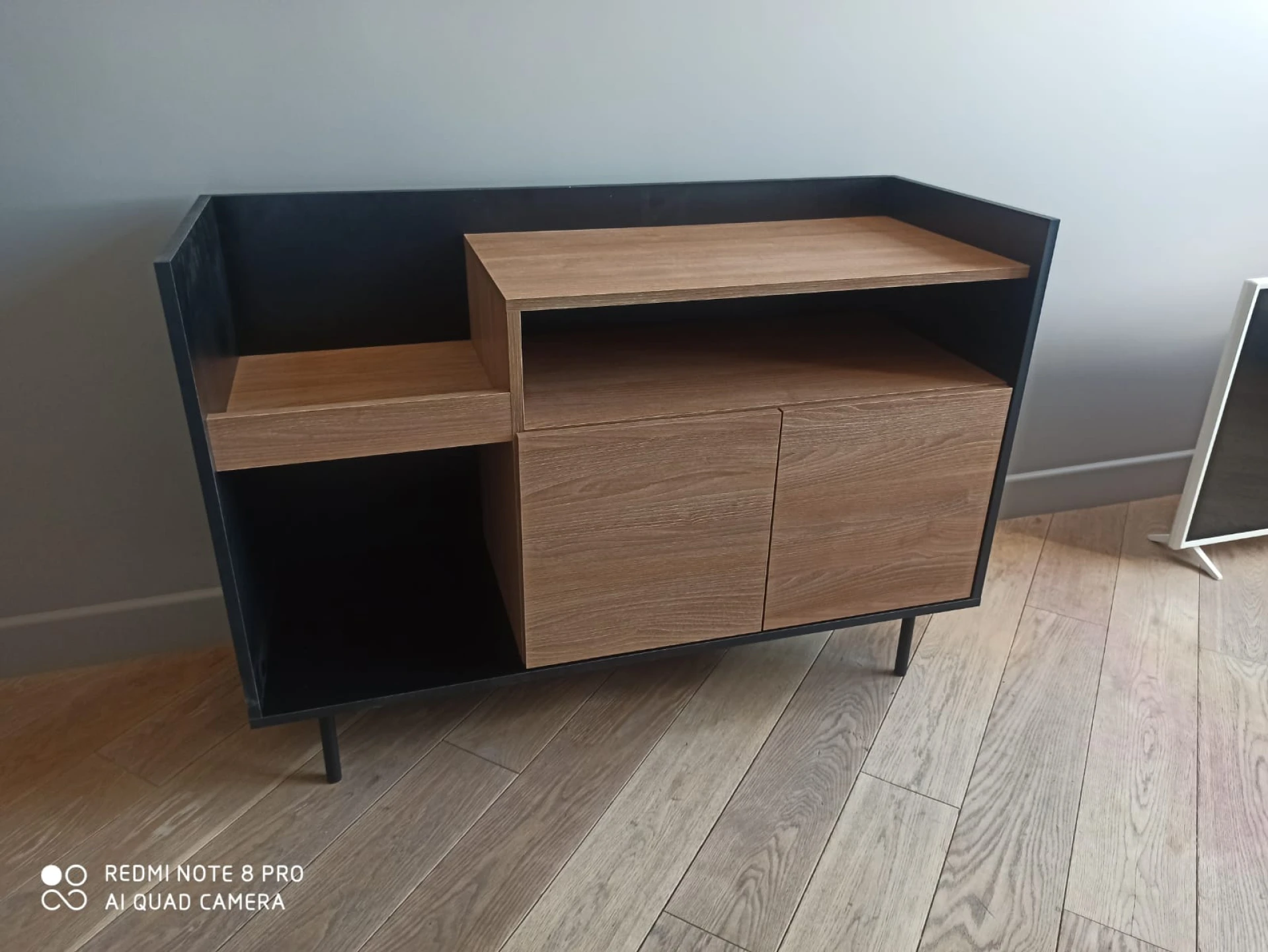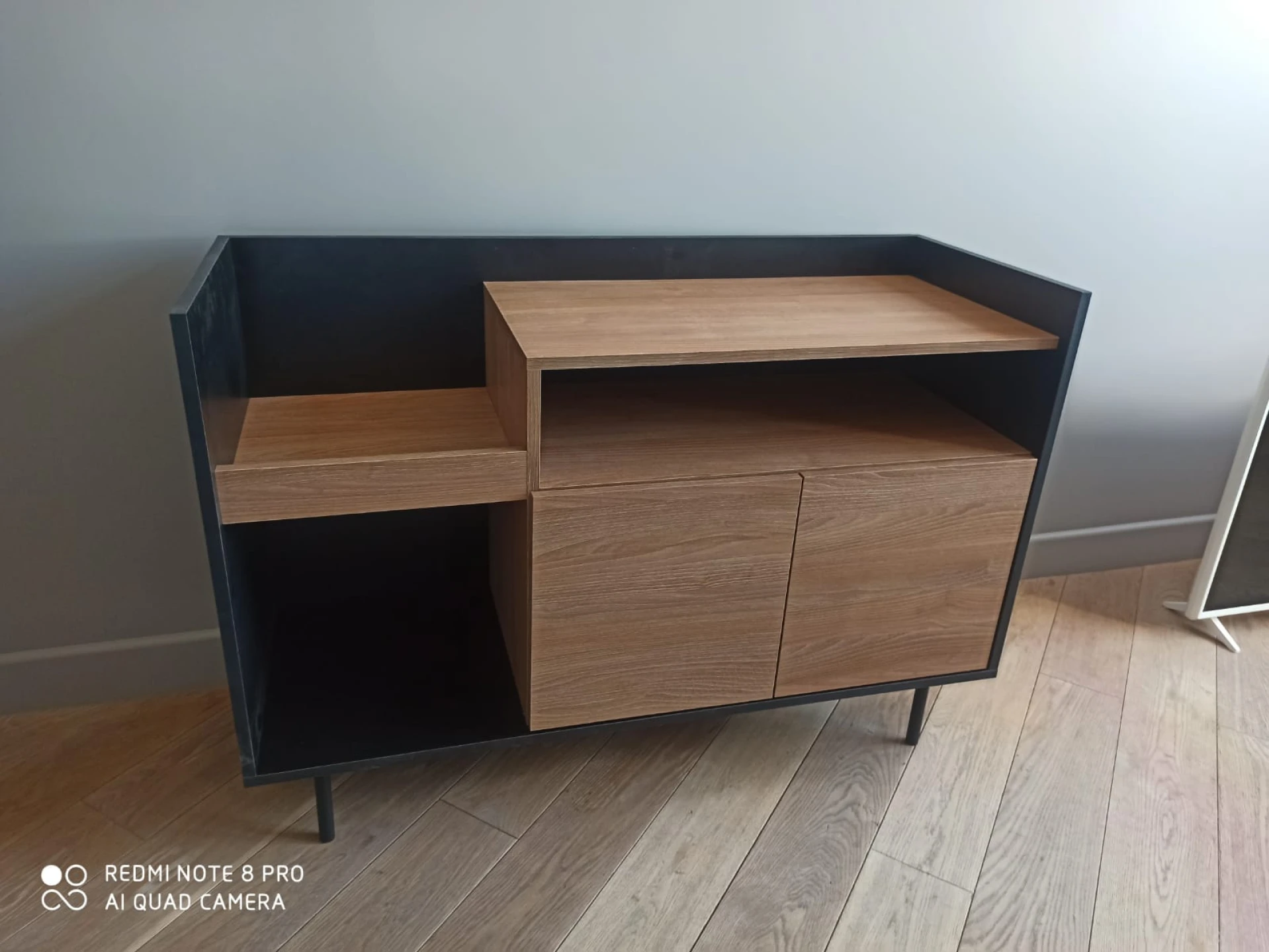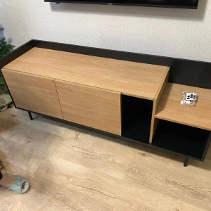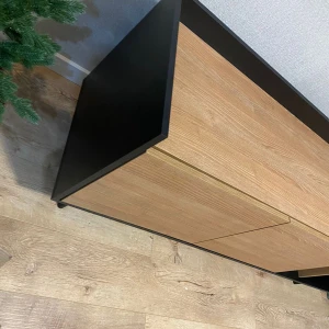 Система открывания дверей - Push-to-Open («нажал-открыл»). Соединительная фурнитура – Hettich. Материалы корпуса и фасада – ЛДСтП толщиной 16 мм. Опоры – металлические, окрашенные черной эмалью, высотой 160 мм, диаметром 20 мм, с пластиковыми подпятниками. Тумбу рекомендуется крепить к стене для защиты от опрокидывания (крепежи входят в комплект).