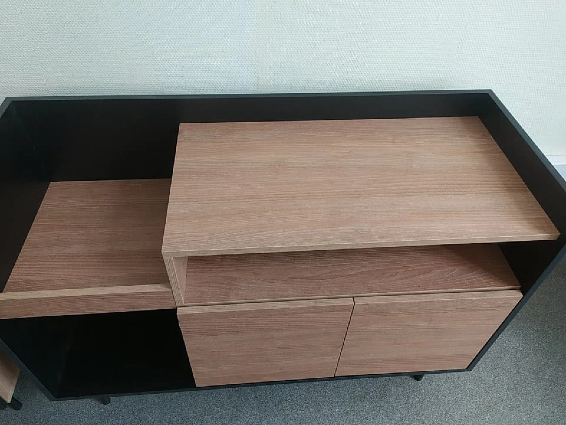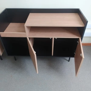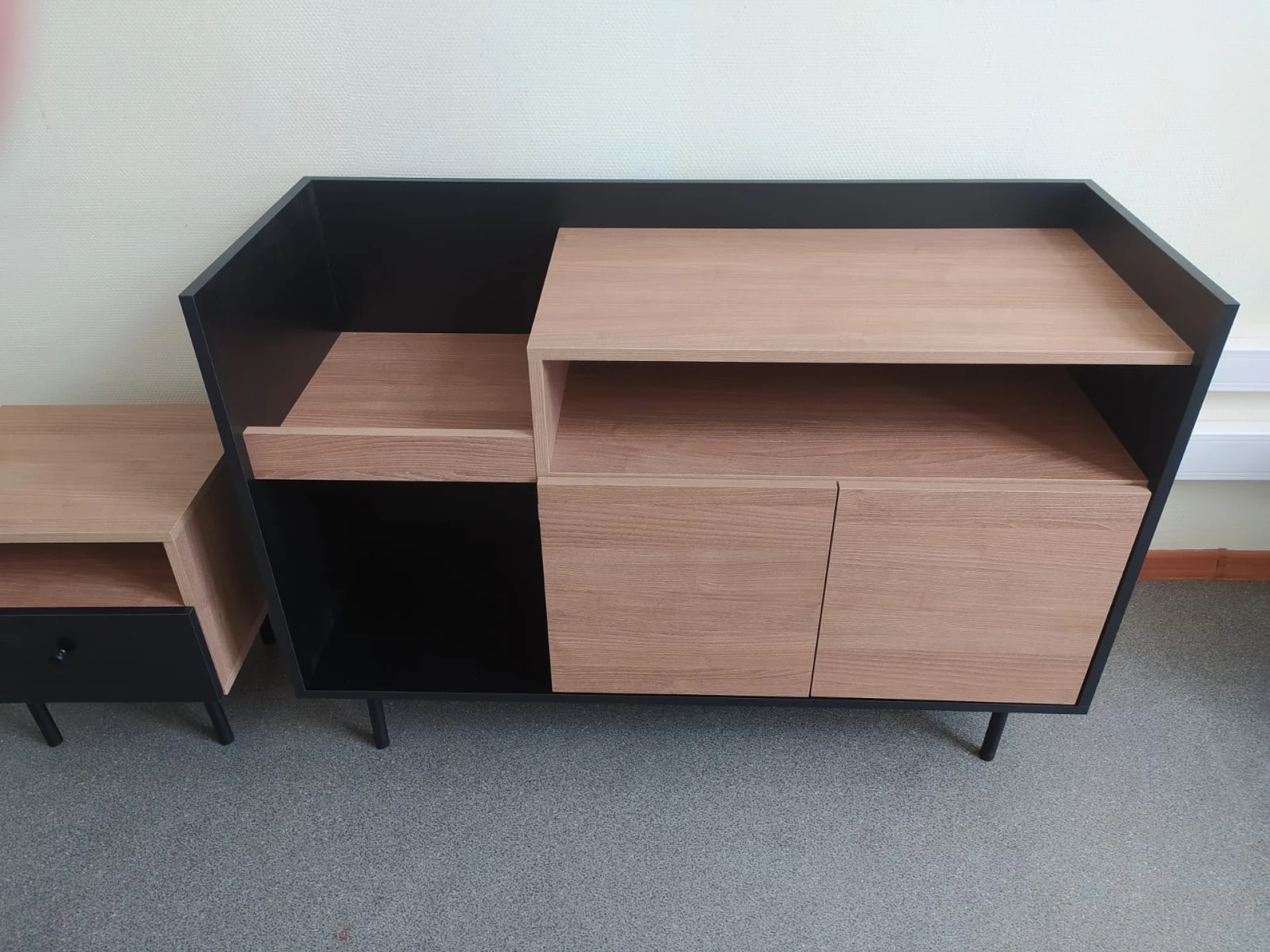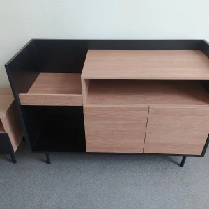 Система открывания дверей - Push-to-Open («нажал-открыл»). Соединительная фурнитура – Hettich. Материалы корпуса и фасада – ЛДСтП толщиной 16 мм. Опоры – металлические, окрашенные черной эмалью, высотой 160 мм, диаметром 20 мм, с пластиковыми подпятниками. Тумбу рекомендуется крепить к стене для защиты от опрокидывания (крепежи входят в комплект).