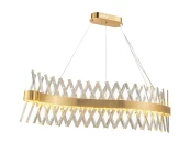 Люстра Sunwave выдержана в минималистичном стиле, с использованием экологичных материалов высокого качества. Сквозь золотистый металлический каркас волнообразной формы под углом проходят тонкие трубки из прозрачного стекла. Они пересекаются между собой с образованием сверху и снизу от каркаса ажурного полотна с рисунком из мелких ромбов.