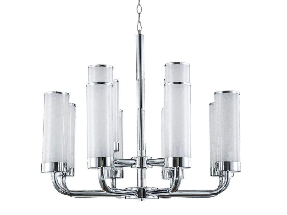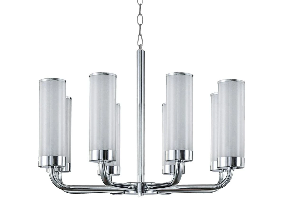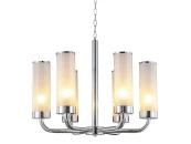 Модель содержит 6 цоколей, ориентированных вверх и рассчитанных на подключение лампочек мощностью 25 Вт. Матовые плафоны выполнены в виде узких высоких цилиндров и декорированы по краям серебряной окантовкой.