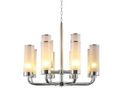 Модель содержит 12 цоколей, ориентированных вверх и рассчитанных на подключение лампочек мощностью 25 Вт. Матовые плафоны выполнены в виде узких высоких цилиндров и декорированы по краям серебряной окантовкой.