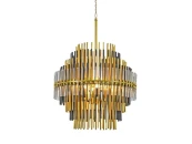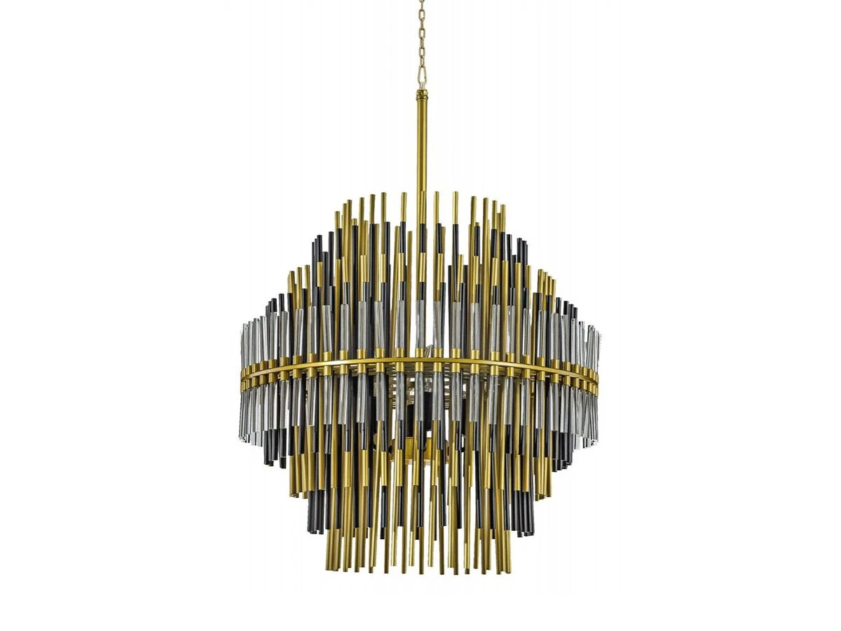 Люстра Emile Round шарообразной формы, на основе металла и стекла. Состоит из множества мелких трубок серебристого, золотого и черного цвета, которые соединяются друг с другом и образуют яруса с плавным переходами между ними.
