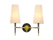 Бра Simple Twins выполнен на основе металлического каркаса, состоящего из золоченных и черненных элементов. Лампы с белыми абажурами в форме усеченного конуса соединяются между собой при помощи стилизованного под золото горизонтального держателя, который по центру крепится к круглой планке, а концами охватывает стержни, отходящие от цоколя. Текстильные абажуры мягко рассеивает исходящий от лампочек световой поток и способствует созданию в комнате приятной обстановки.