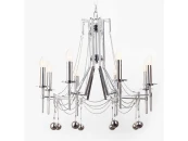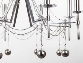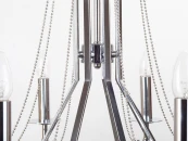Люстра Rocco Silver 12 сложной конструкции из стилизованного под серебро металла. Состоит из множества изящных элементов разных форм. От верхнего основания модели отходят тонкие стержни с квадратным сечением, которые, дважды изогнувшись под углом 135 градусов, переходят в держатели для ламп. Цоколь в форме свечи оснащен продолговатой лампочкой, имитирующей огонь в зажженном состоянии. В качестве дополнительного декора используются вертикально расположенные трубки, круглые металлические шарики, свисающие с конструкции, и тонкие цепочки, проходящие сверху вниз и охватывающие изделие по бокам.