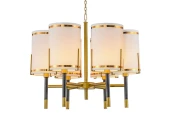 Через центральный элемент каркаса проходит вертикальная трубка, которая крепится к цепочке. Плафоны цилиндрической формы выполнены из матового стекла, украшены снизу и сверху золотой каймой.
