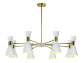 Люстра Elisium выполнена в светлом дизайне, на основе золотистого металлического каркаса и стеклянных элементов из матового стекла. Восемь держателей с лампами расходятся лучами из одного центра в форме белого круга, закрепленного на кронштейне.