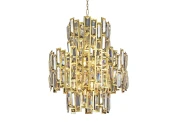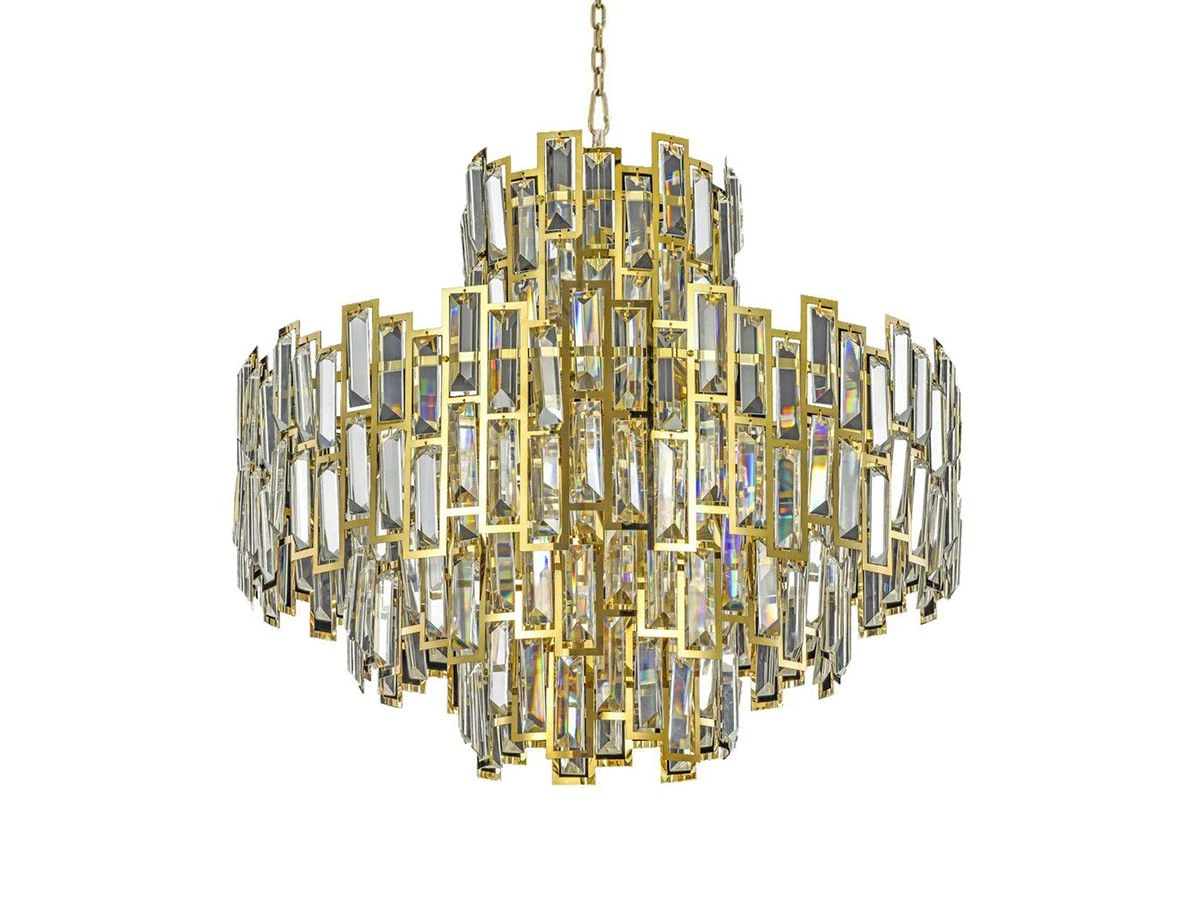 Люстра Queen 400 со множеством спадающих вниз стеклянных пластин с золотым обрамлением. Свет, отраженный под разными углами от зеркальной поверхности пластин, эффектно рассыпается разноцветными бликами.