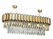 Люстра Nordic L900 выполнена в форме прямоугольника со скругленными углами. Верхняя часть составлена из объемных металлических пластин золотого цвета, с затемненными боковыми гранями. Свободно спадающие подвески из прозрачного стекла плотной стеной окружают лампочки, рассеивают и приглушают исходящий от них свет. Лучи частично преломляются на стекле, с образованием необычных визуальных эффектов.