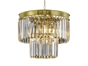 На золотистую металлическую основу крепится множество длинных тонких полосок из прозрачного стекла, способных под действием света эффектно переливаться. Модель рассчитана на установку 4 ламп, представлена в нескольких вариантах, с различными типами оформления.