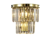 Светильник Odeon Golden Wall на металлической основе, со сложной конструкцией из множества элементов. Изделие весит 3 кг и крепится на потолочную планку, состоит из двух ярусов с плавными переходами между ними. Длинные тонкие полоски из прозрачного стекла элегантно спадают вниз. Свет, который отражается от их поверхности под разными углами, создает эффектные блики.