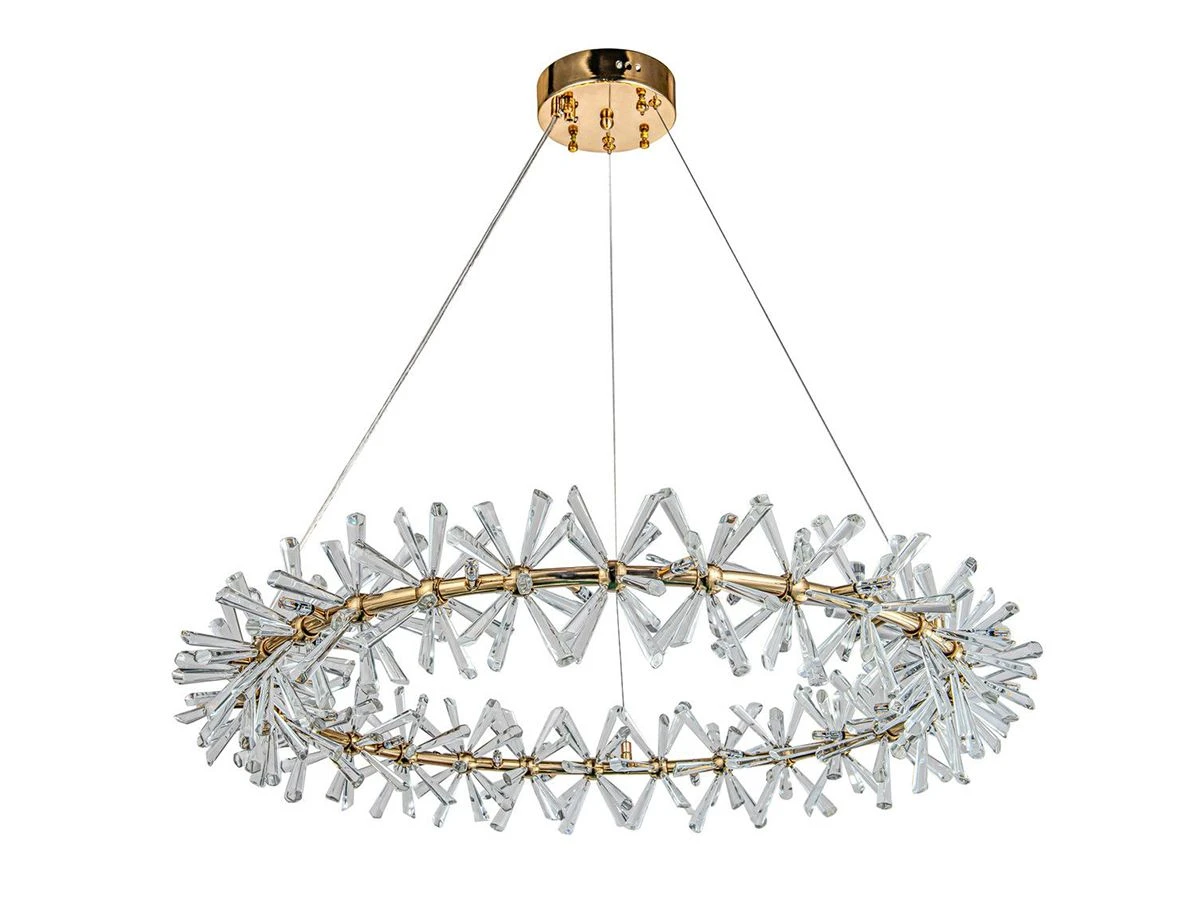 Бра Star Light оформлен в золотистых тонах и предназначен для современных интерьеров квартир и частных домов. На слегка изогнутом металлическом стержне удерживаются элементы из прозрачного стекла, выполненные в виде удлиненных миниатюрных конусов. Они отходят веером из нескольких точек, с образованием необычной структуры, которая красиво смотрится и частично задерживает собой свет, устраняя его слепящий эффект.