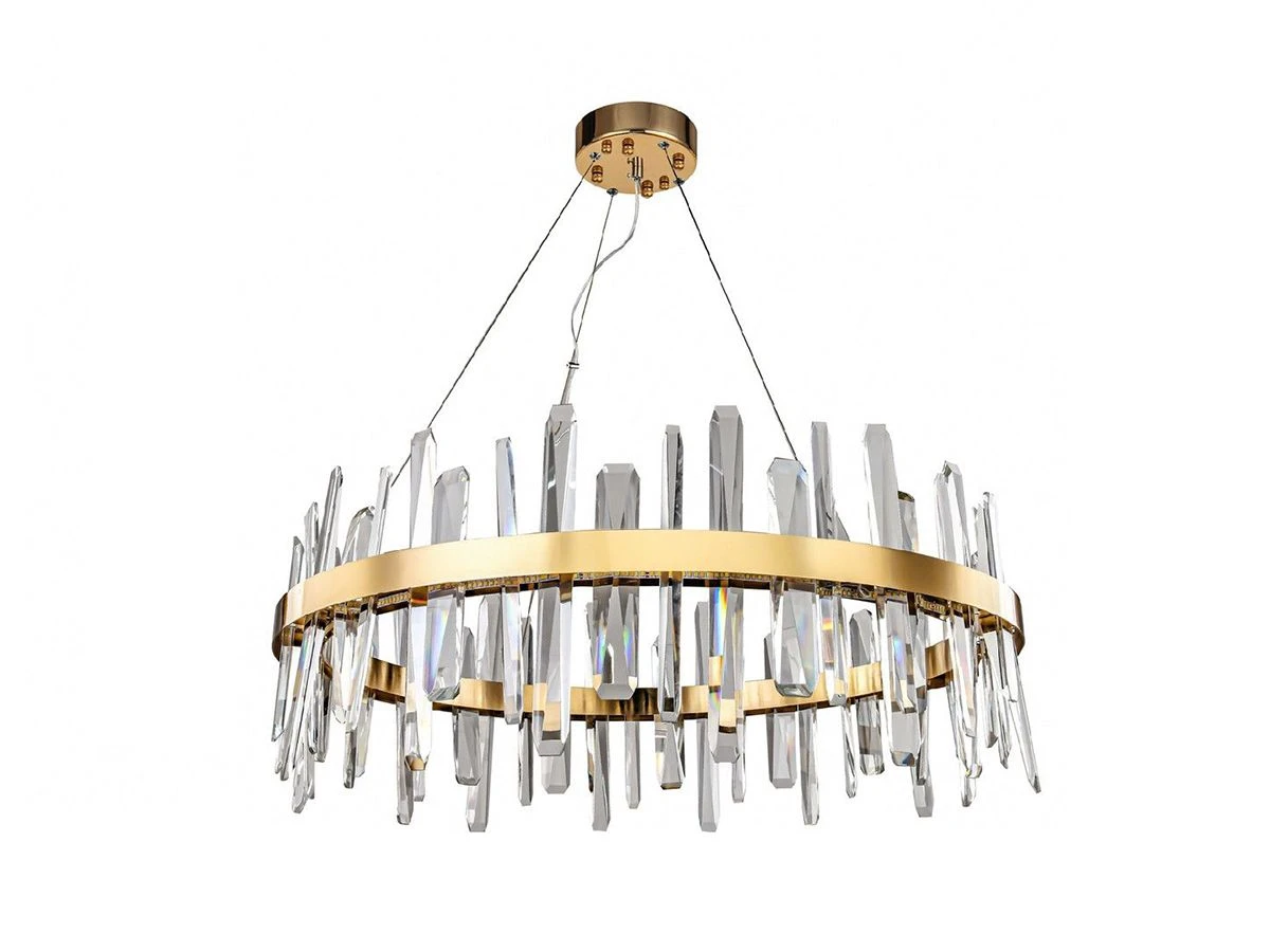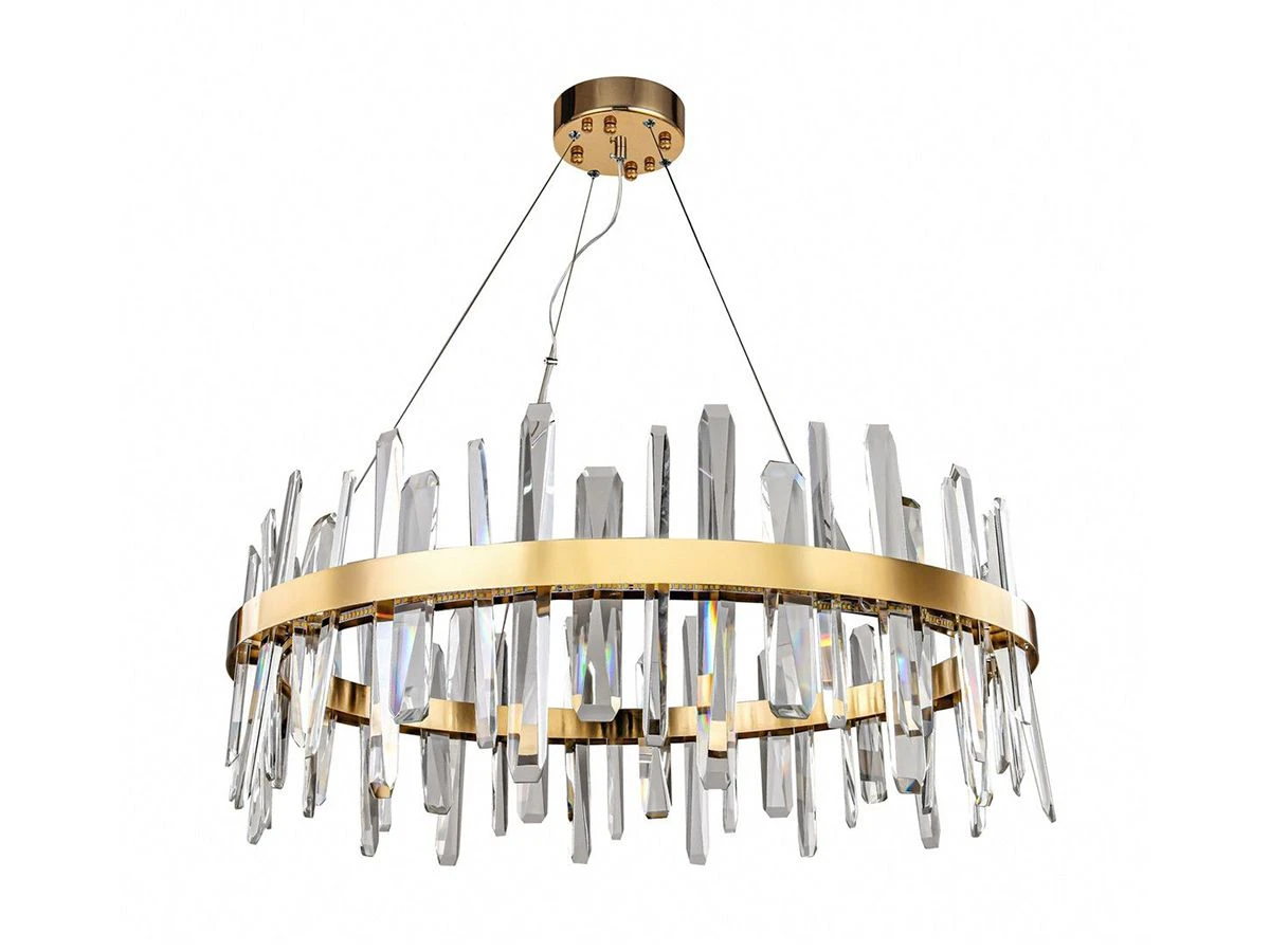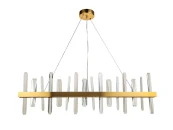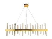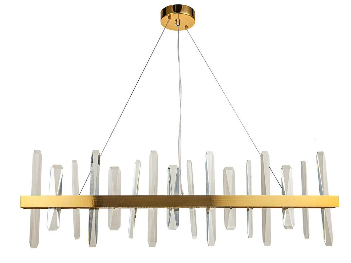 Люстра Gertrudis вытянутой формы, со множеством прозрачных стеклянных элементов, прикрепленных к пластине из металла под цвет золота. Светильник подвешивается к потолочной планке посредством трех тонких металлических нитей повышенной прочности. Подходит для оформленных в современном стиле квартир, гостиниц, офисов, ресторанов, ночных клубов и кафе.