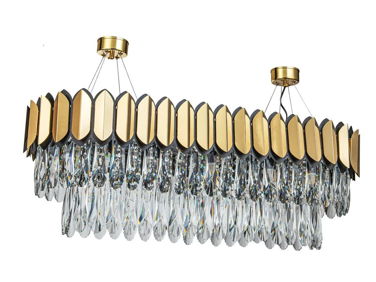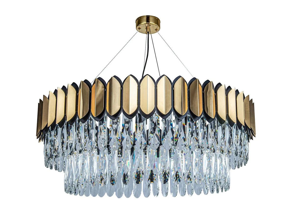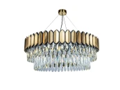 Люстра Nordic круглой формы выполнена в оригинальном стиле, вобравшем в себя элементы классики, ретро и модерна. По верхней части модели проходит кольцо, составленное из металлических пластин, стилизованных под золото и оттененных по периметру. Удлиненные элементы из прозрачного стекла свободно спадают вниз, закрывая собой цоколи G9 с установленными на них лампочками. Свет, проходящий через стеклянную преграду со множеством граней, преломляется под разными углами с созданием интересных визуальных эффектов.
