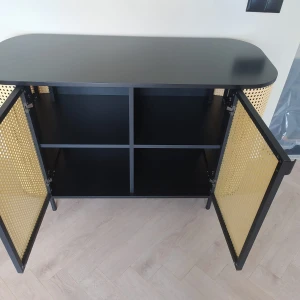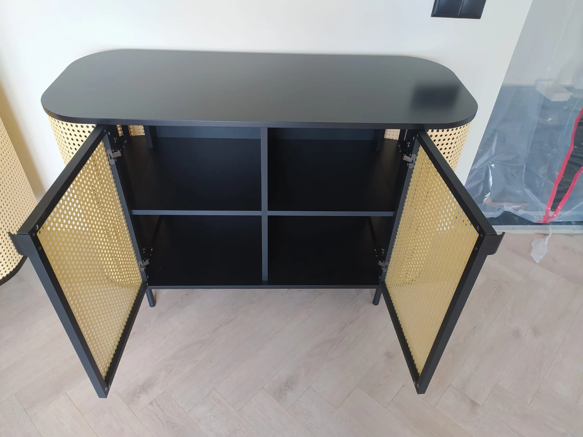 Сервант имеет две распашные двери, петли с доводчиками. Двери глухие, черные. Тумба за дверями разделена вертикальной перегородкой, в каждом отделении по одной съёмной полке. Полки по высоте не переставляются. Боковые отделения закругленной формы обтянуты искусственным ротангом. В отделении имеется не съёмная полка, которая является продолжением полки основой части.