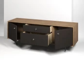Коллекция мебели в стиле minimaluxe. Чистота линий и пропорций, свойственная минимализму, гармонично дополнена фактурами. Элегантное сочетание дерева и натуральной кожи является уникальной особенностью коллекции. Декоративная фурнитура выполнена из нержавеющей стали с кожанным декором по авторским эскизам.Материалы: корпус - МДФ, шпон ореха / дуба на выбор, полуглянцевый прозрачный лак; фасады - МДФ, кожа коричневого / черного цвета на выбор, полуглянцевый прозрачный лак; ящики - МДФ, шпон ясеня, прозрачное минеральное масло; декоративная фурнитура - нержавеющая сталь. Фурнитура - петли и направляющие скрытого типа с доводчиками. Варианты отделок представлены на последнем фото.Конфигурация: 2 двери /2 ящикаИзделие поставляется в собранном виде.