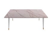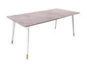 Обеденный дизайнерский стол Рио. Кажущаяся простота дизайна этого стола, компенсируется качеством материалов. Столешница: испанская керамика 6мм на закаленном стекле 6мм. Ножки: металл с белым глянцевым окрашиванием, металлические золотые наконечники.