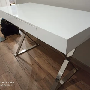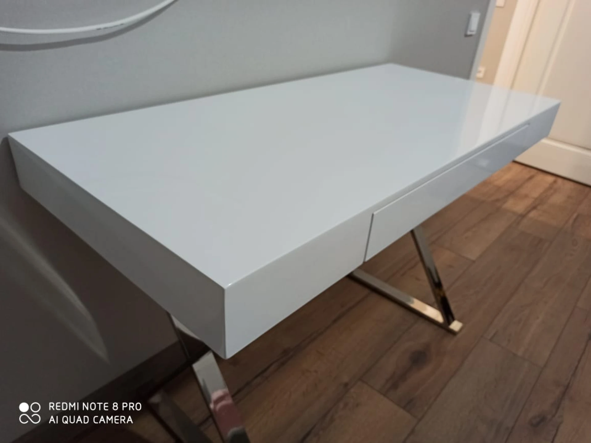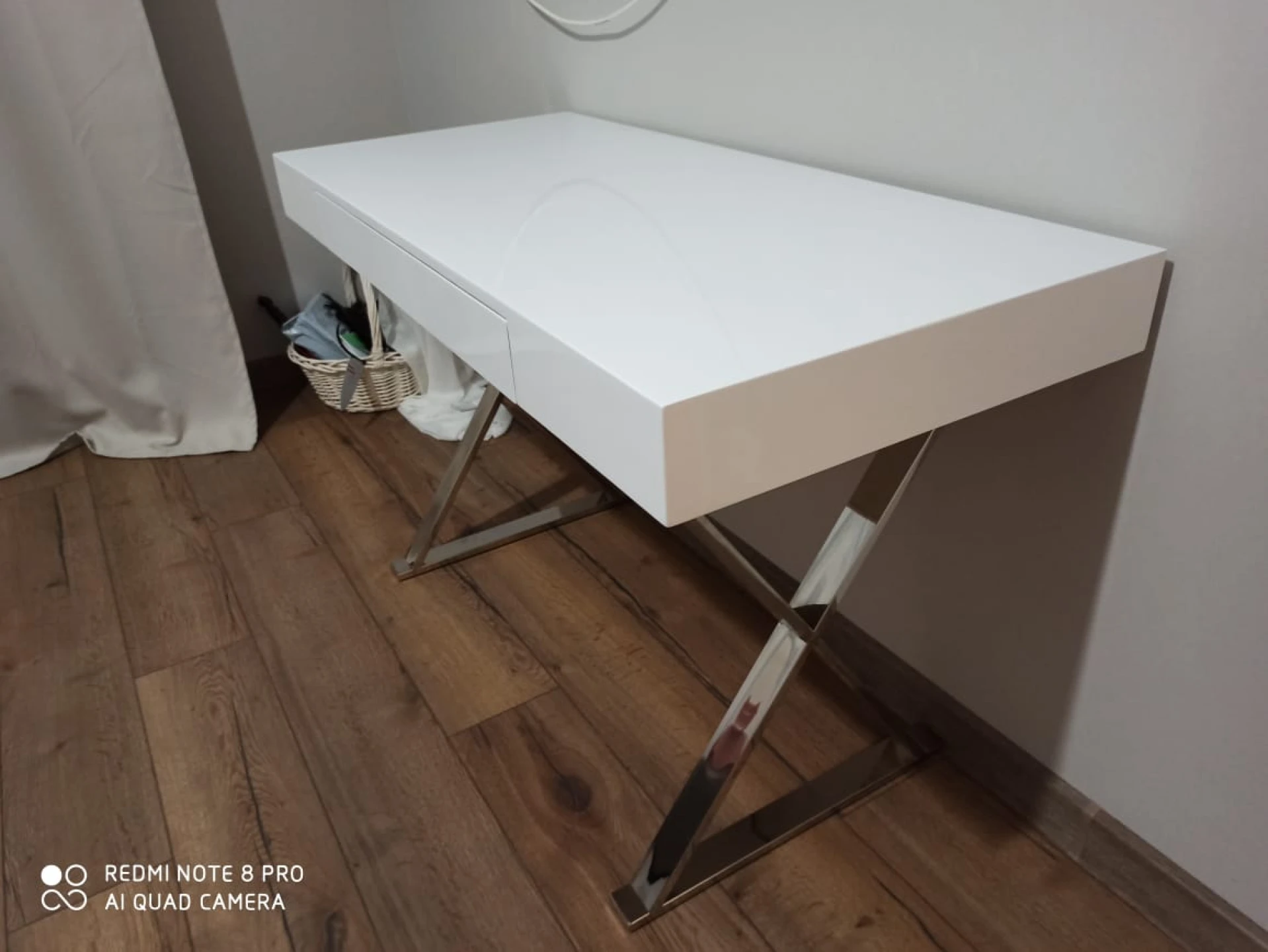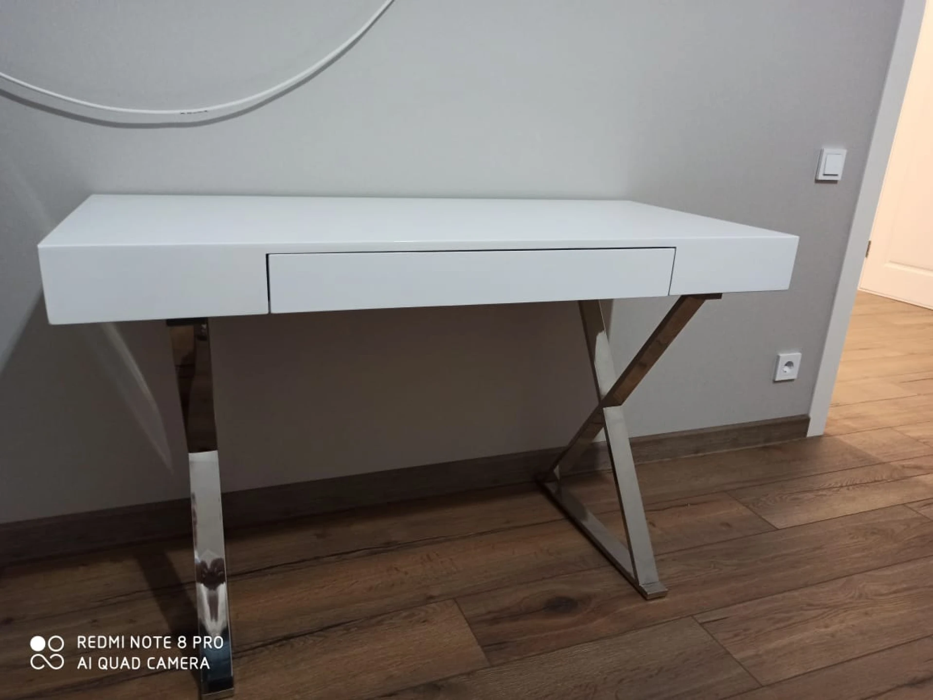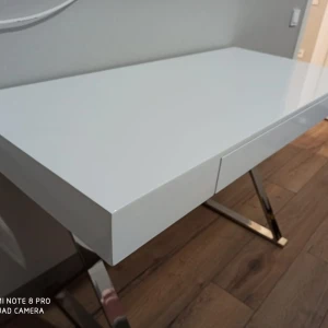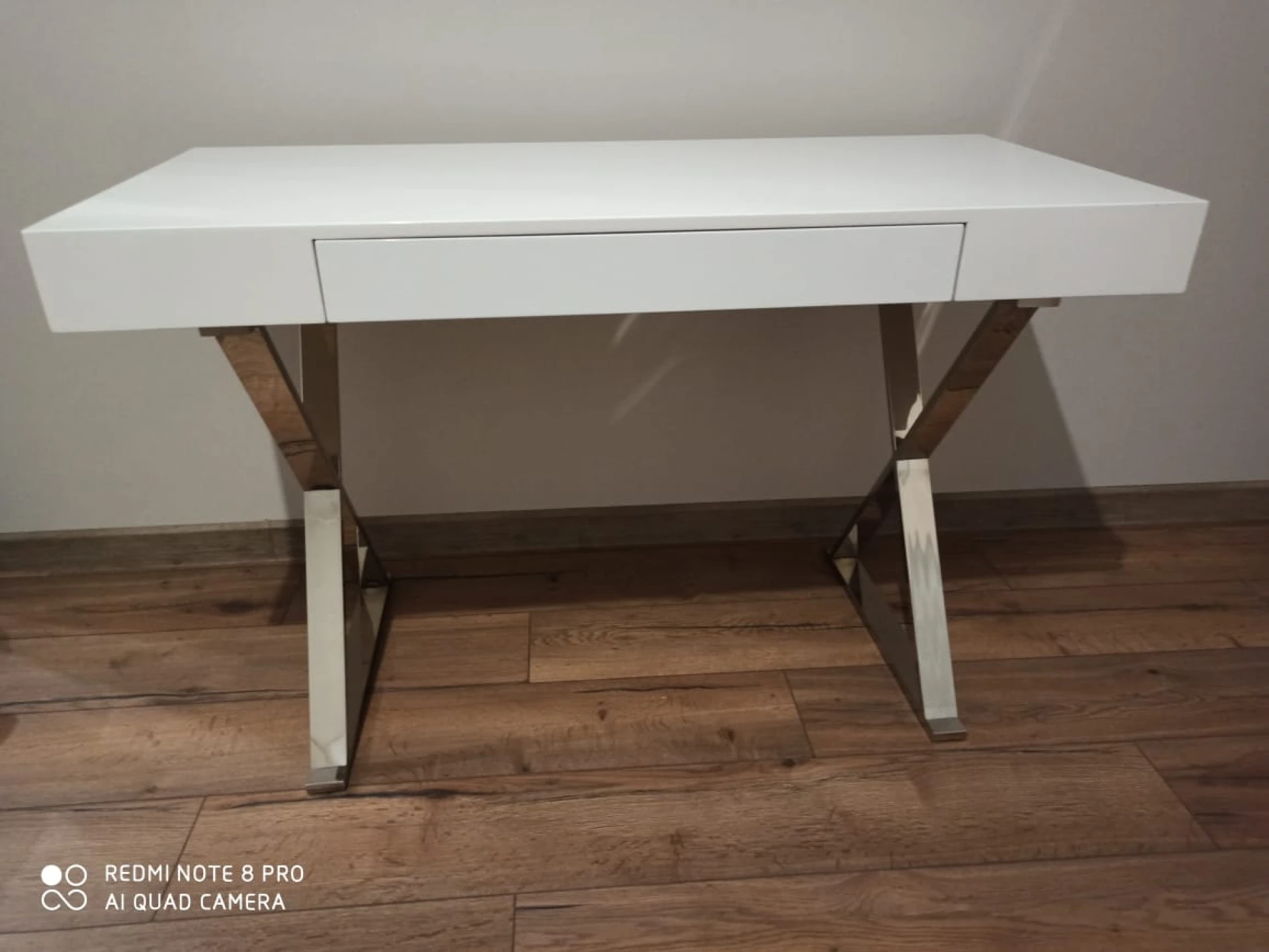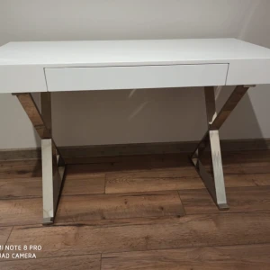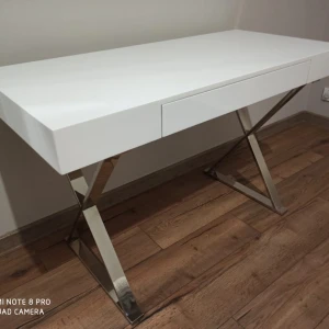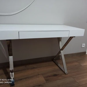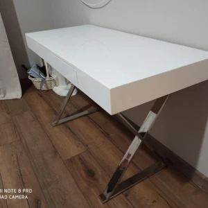 Стол-консоль с выдвижным ящиком. Столешница - глянцевое МДФ, ножки из нержавеющей стали хромированные. Цвет: белый.