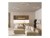 Материал арматуры — алюминий, оттенки — черный, латунь. Актуальная форма окружности. Положение колец подвесных моделей регулируется. Бра с источником света, направленным на стену — трендовая отраженная подсветка. Интегрированные LED-источники света. Цветовая температура 3000К или 4000К – устанавливается на этапе монтажа. Диммируемая яркость.