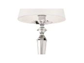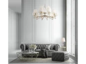 Металлическая арматура с гальваническим покрытием цвета никель. Абажуры из льна, нанесенного на ПВХ. Цвет абажуров – белый. Декор центральной части и рожков – прозрачное стекло. Высота люстр регулируется.