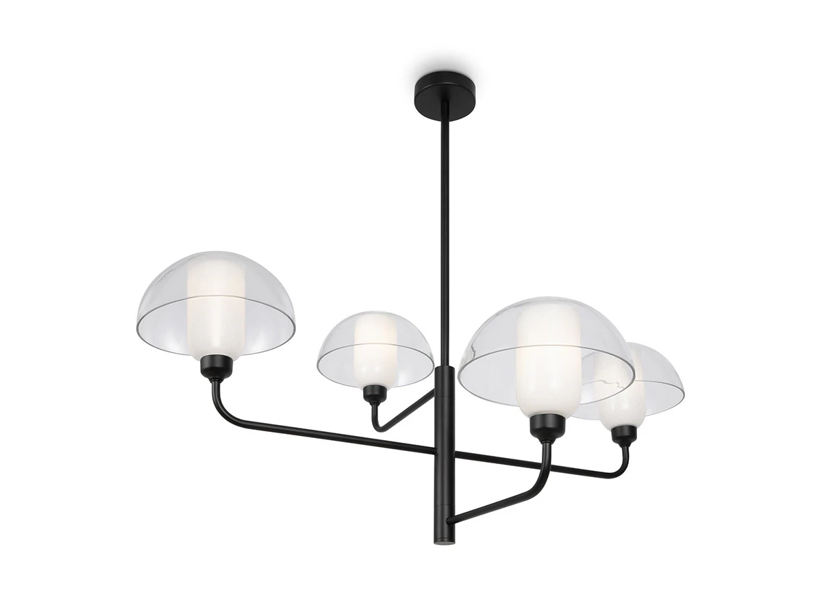 Металлическая арматура, цвет - черный. Светильники стилизованы под форму песочных часов с обтекаемой формой. Керамические элементы с глянцеовй глазурью. Подвесные светильники с плафонами из белой керамики с прозрачным, черно-белым, золото-белым и белым стеклом. Регулируемая высота подвесных светильников.