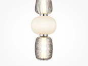 Металлическая арматура, цвет - золото, хром. Микс плафонов округлых и вытянутых форм из белого матового и прозрачного стекла с сетчатым и с линейным повторяющимся рельефным рисунком. Регулируемая высота подвесных моделей, провод - 3 метра. LED-источник света, цветовая температура 3000К.