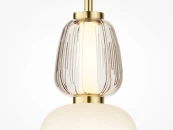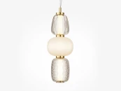 Металлическая арматура, цвет - золото, хром. Микс плафонов округлых и вытянутых форм из белого матового и прозрачного стекла с сетчатым и с линейным повторяющимся рельефным рисунком. Регулируемая высота подвесных моделей, провод - 3 метра. LED-источник света, цветовая температура 3000К.