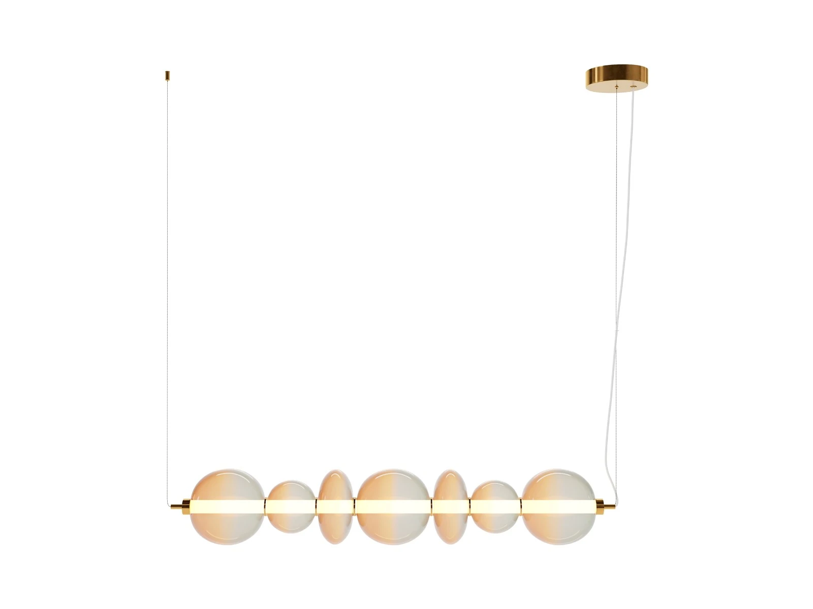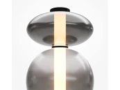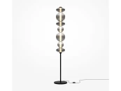 Светильники с тонированными выдувными стеклянными плафонами (дымчатыми или янтарными) и металлической арматурой (черной или цвета латуни). Окрашивание плафонов градиентное. Источник света: LED. Световой элемент установлен внутри акрилового рассеивателя. Цветовая температура источника света – 3000К, угол рассеивания — 120°. Торшеры снабжены Push-кнопкой на проводе.