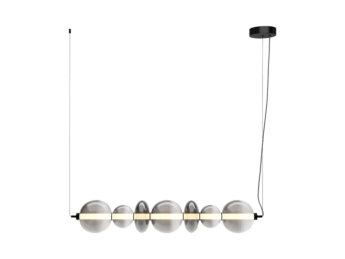 Светильники с тонированными выдувными стеклянными плафонами (дымчатыми или янтарными) и металлической арматурой (черной или цвета латуни). Окрашивание плафонов градиентное. Источник света: LED. Световой элемент установлен внутри акрилового рассеивателя. Цветовая температура источника света – 3000К, угол рассеивания — 120гр. Торшеры снабжены Push-кнопкой на проводе.