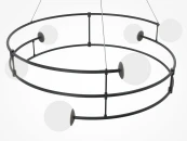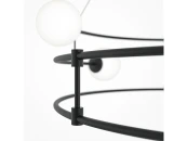 Арматура из металла в двух оттенках: черный и золото. Плафоны из матового выдувного стекла крепятся к металлическим дугам. Высота регулируется с помощью тросов.