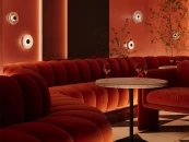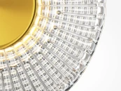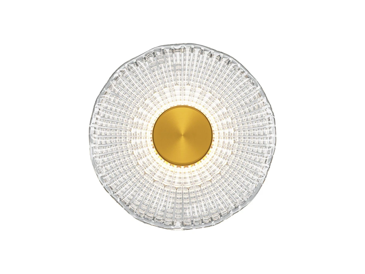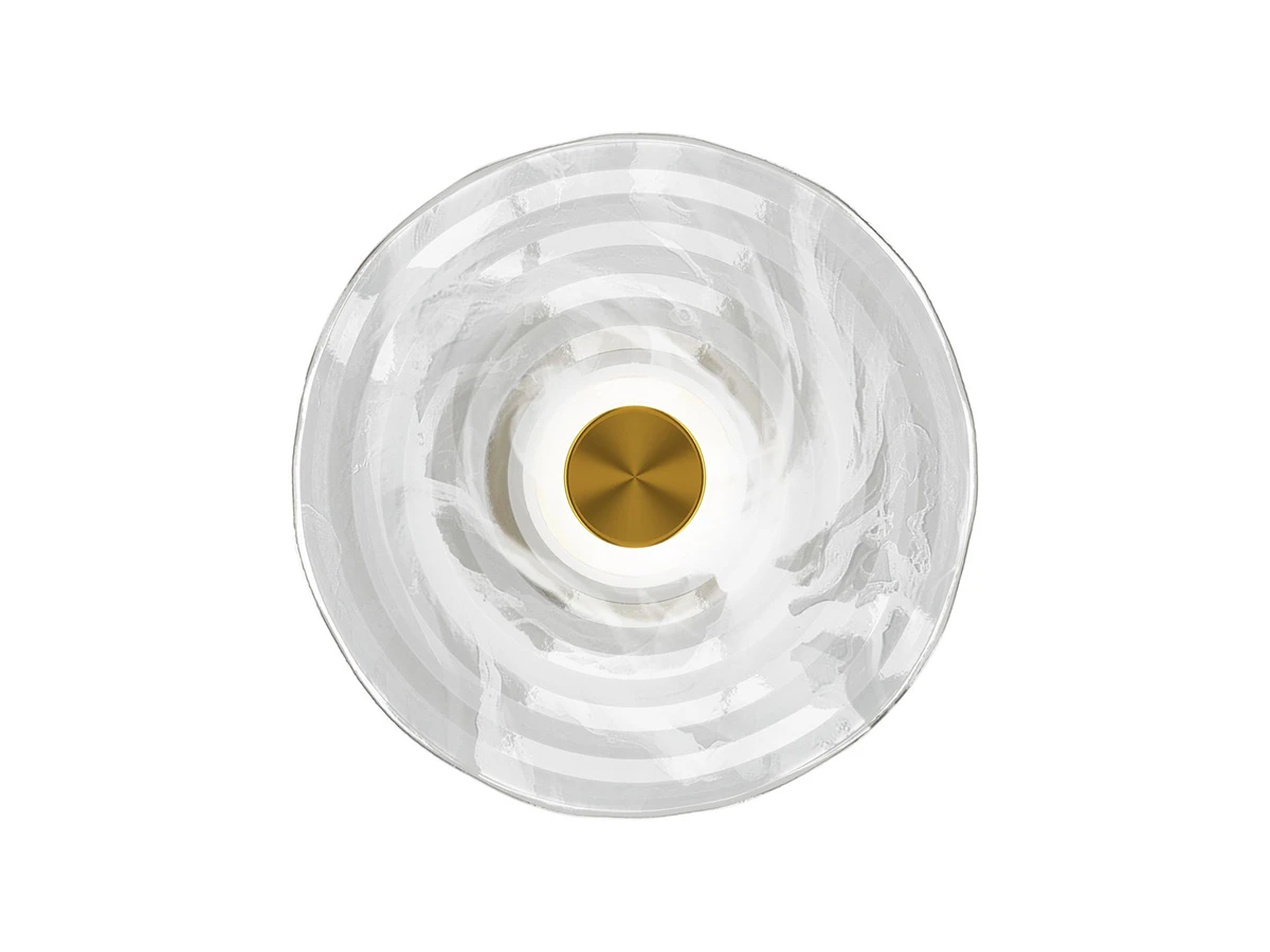Металлическая арматура, цвет - латунь. Декоративные плафоны из литого стекла. Они рассеивают свет и дают легкие блики на стенах. Стекло плафонов может быть прозрачным или тонированным с паттерном молочного оттенка. Встроенный LED-источник света имеет цветовую температуру 3000 К, угол рассеивания — 120 градусов.