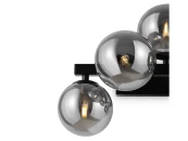 Металлическая арматура в четырех цветах: матовый черный, хром, золото, латунь. Плафоны — выдувное стекло. Цвета — дымчатый, янтарный, коньячный. Дизайн с имитацией молекулярной структуры. Высота подвесных светильников регулируется тросом. Лампа с цоколем G9.