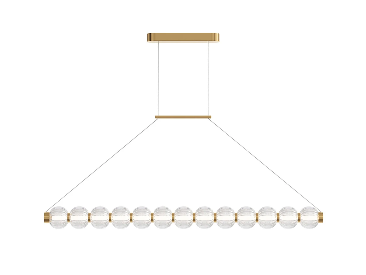 Арматура из металла, цвет – хром. Акцентный декор в виде рельефных сфер из литого стекла. Источник света – светодиодная лента – скрыта под акриловым рассеивателем. Регулируемая высота подвесных светильников.