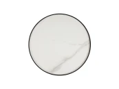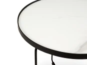Материал столешницы - верхний слой из спеченного камня с фактурой под керамику на плите из МДФ, установленная на металлическое основание черного матового цвета круглой формы.