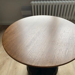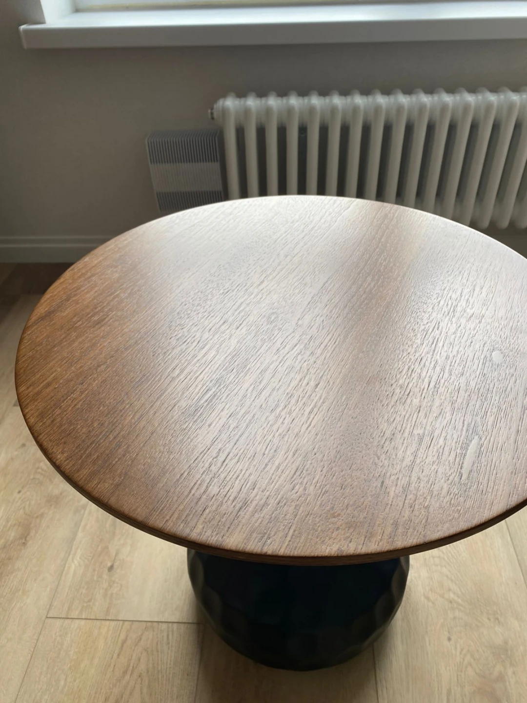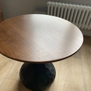 Материал столешницы - МДФ толщиной 25мм со шпоном грецкого ореха, основание - железное с черным порошковым покрытием.