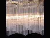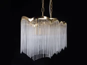 Металлическое основание потолочной люстры гальванизировано в цвет латунь. Люстра декорирована прозрачными стеклянными трубочками.
