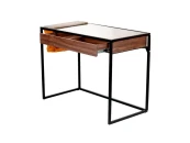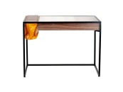 Стол письменный, черное, матовое основание из металла, отделка ящиков - шпон ореха, экокожа, столешница из закаленного стекла.