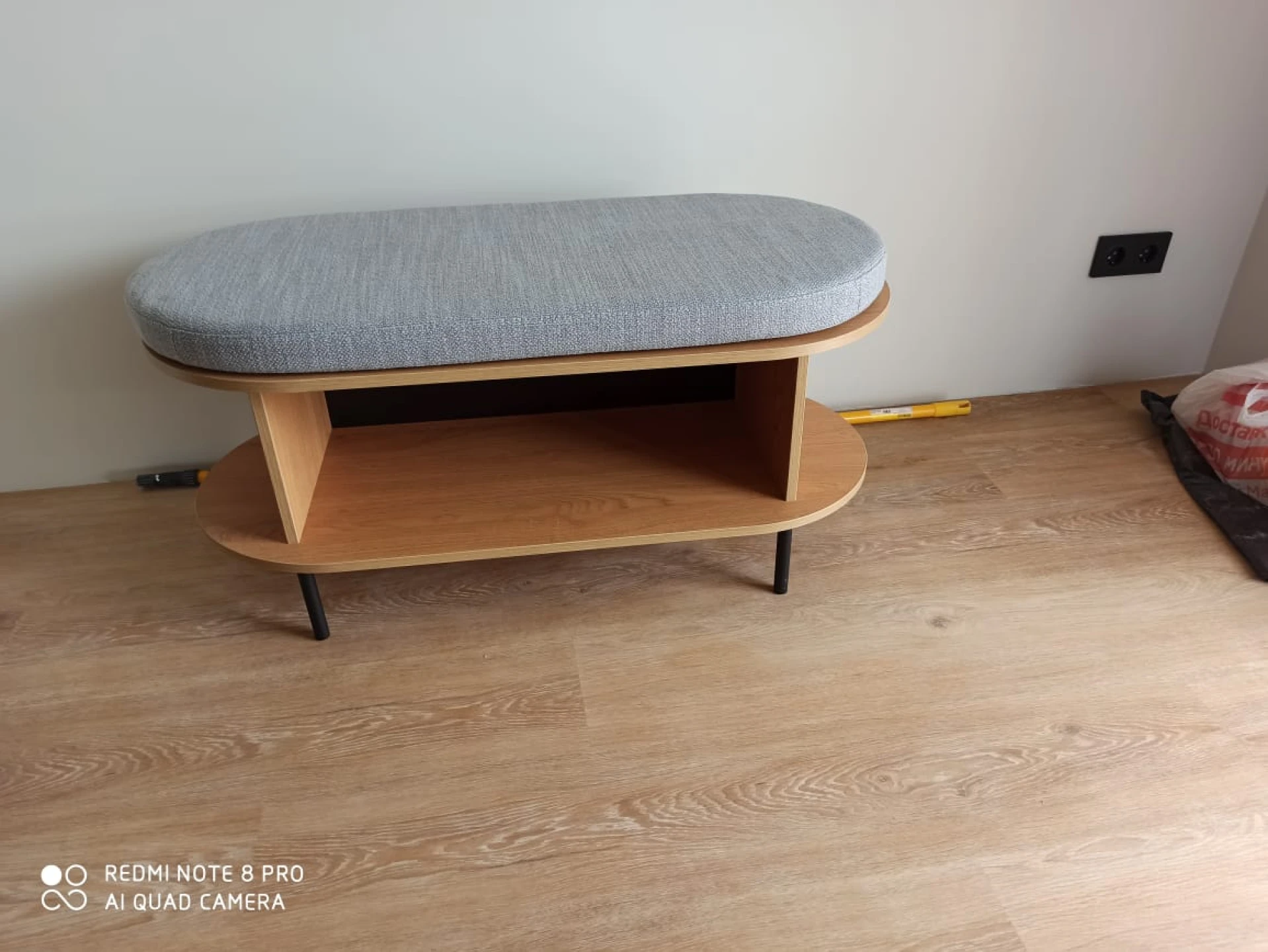 Обувница Movie представляет собой два щита овальной формы с установленными между ними вертикальными стенками. В нише под обувь имеется задняя стенка из ЛДСП черного цвета. Обувница установлена на металлические ножки черного цвета. Диаметр ножек 20 мм, высота 160 мм.