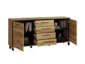 Рисунок ЛДСП Дуб Эвок прибрежныйимеет свойство смещаться. Модульная композиция состоит из арт. 1001.М1 арт.1009.М11010.М1. Ручка скоба, цвет черный, материал - металл. Стекло на фасаде толщина 4 мм. Полка стеклянная - толщина 5мм, максимальная нагрузка до 5кг. Опора пластиковая, регулируемая, цвет черный.