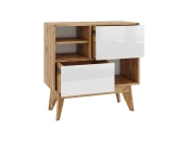 Прошлое столетие ознаменовалось появлением огромного числа стилей, которые отображали основные тенденции новой эпохи: лаконичность, четкость геометрических линий, минимальное количество фурнитуры. Всеми указанными свойствами обладает тумба Хелен, визитной карточкой которой можно назвать оригинальное расположение открытых и закрытых полок. Для производства модели использована ЛДСП EGGER. Основной оттенок – «дуб вотан», создающий в любом помещении атмосферу тепла и уюта. Фасад модели оформлен с помощью евро-плиты EGGER, для которой производитель избрал современный цвет «белый лак». Он придает мебели сдержанность и позволяет сделать ее гармоничной частью композиции.