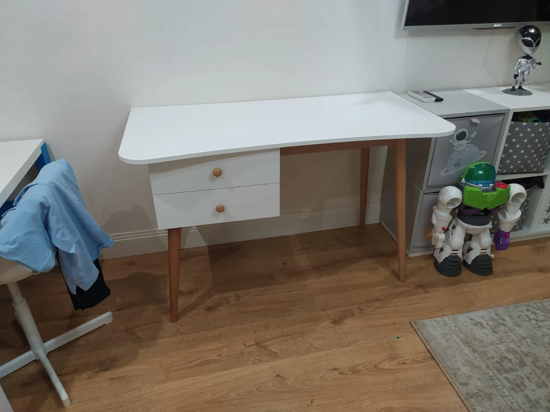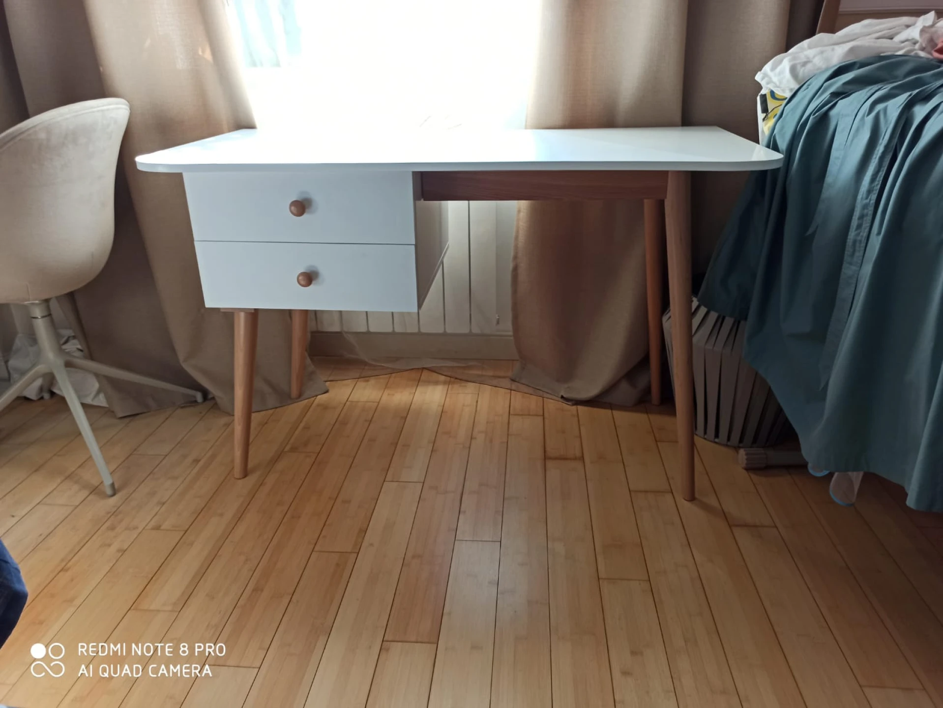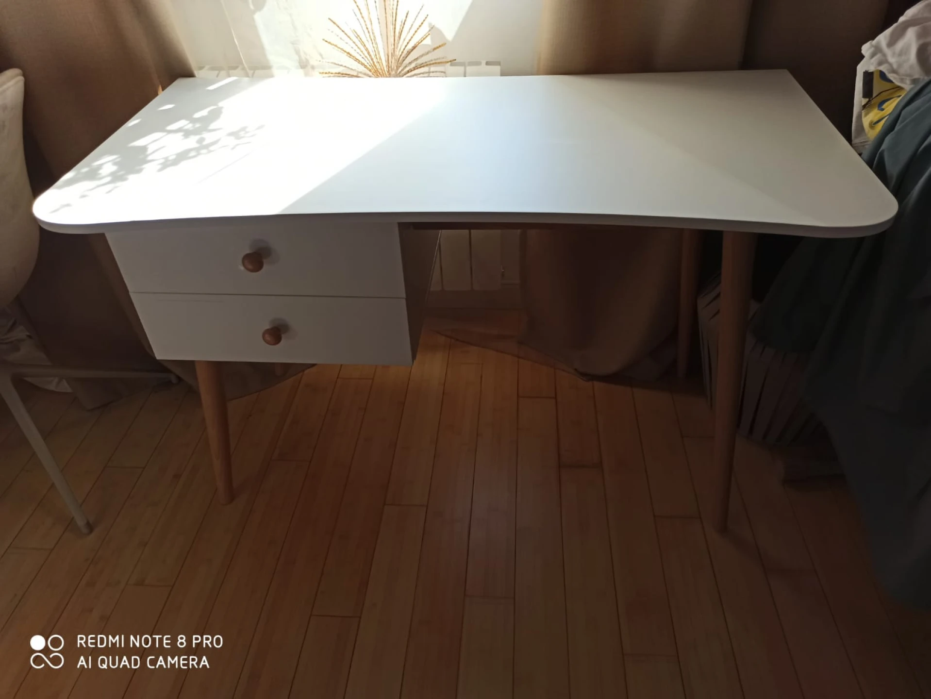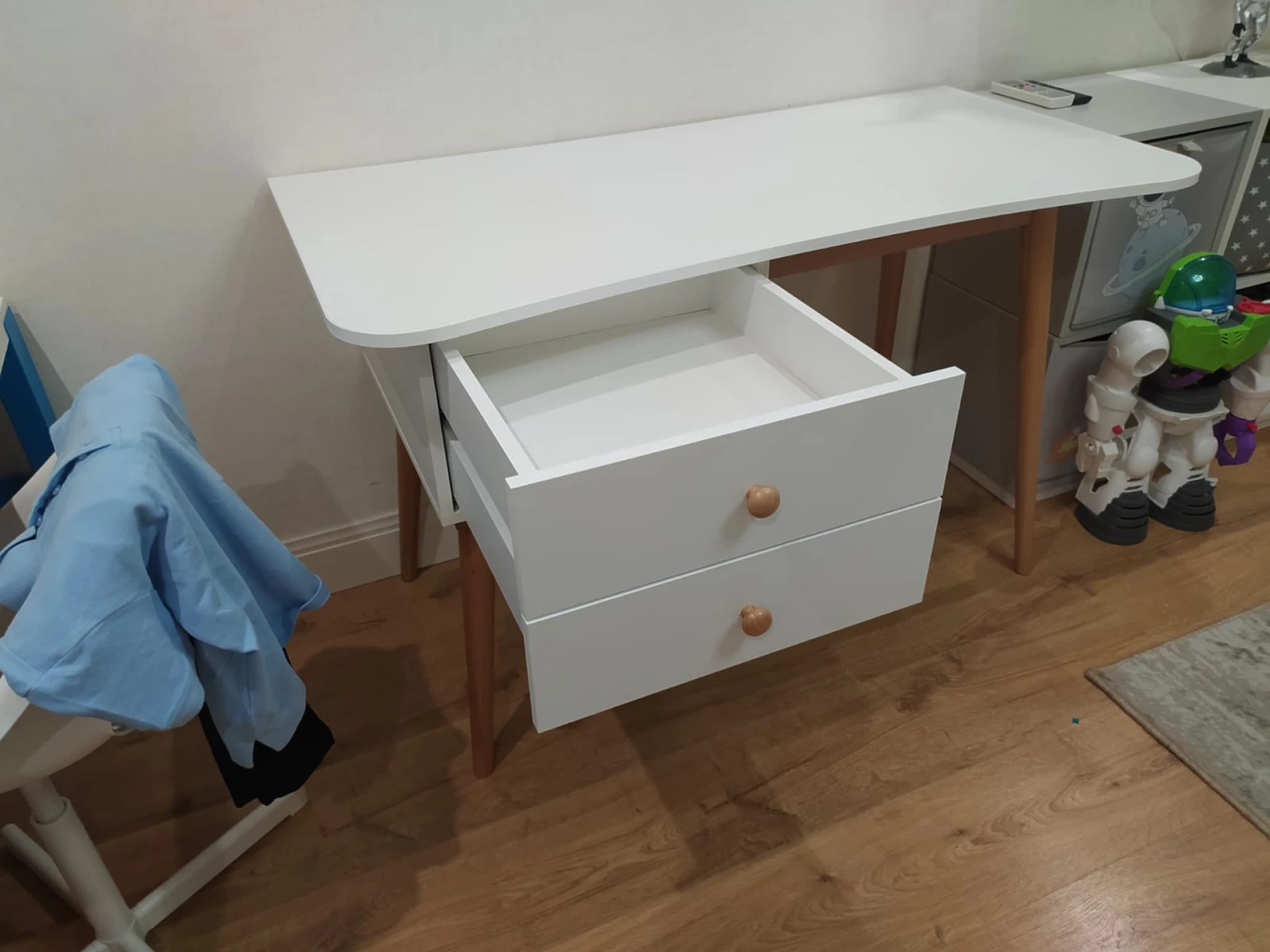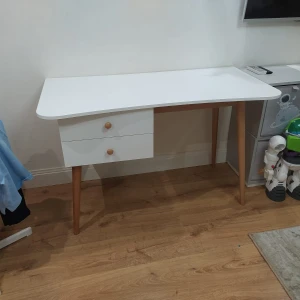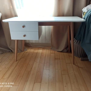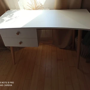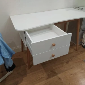 Корпус изготовлен из ЛДСП белого цвета, гладкий, кромка белая. В комплект входят фасады для ящиков так же белого цвета и две буковые ручки Primo Wood, цвет натуральное дерево. Подстолье и ножки изготовлены из древесины бука и покрыты прозрачным лаком.