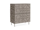 Сервант с четырьмя распашными дверями – две вверху, две внизу. За каждой дверью отделение со съёмной полкой. Перестановка полок по высоте не предусмотрена. Фасады, боковые стенки и крышки изделий коллекции Milton выполнены из МДФ толщиной 16 мм. На фасадах и боковых стенках закреплены детали в виде геометрических фигур из МДФ толщиной 10 мм.