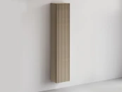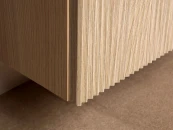 В дизайне выражена доминанта прямых форм, лаконичных линий и элегантного исполнения. Скрытые механизмы открытия дверей, естественная древесная текстура, светлые оттенки, рифление на фасадах дают интерьеру ощущение размеренности, сбалансированности, упорядоченности. Фасады без ручек поддерживают идею отказа от визуального шума, двери открываются по принципу «нажал-открыл».