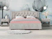 Элегантная интерьерная кровать Ancona, украшенная декоративными пуговицами, которые можно заменить на стразы. Модель изготовлена из ДСП. Обратная сторона изголовья обита спандбондом, но её можно выполнить из основного обивочного материала.