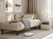 Описание: Мягкое изголовье в рогожке популярных цветов, закругленные углы, декоративный кант, узкие царги делают кровать универсальной для большинства современных интерьеров. Угловое изголовье создает уютную атмосферу. Боковая спинка составляет половину царги, устанавливается на выбор с правой, или с левой стороны кровати. Благодаря двойному изголовью кровать можно разместить в любом месте комнаты. Увеличенное расстояние до царг способствует легкой уборке под кроватью роботом – пылесосом. Обивка кровати: Исполнение доступно в 3-х оттенках мебельной ткани Багама (льняной, бежевый и серый)